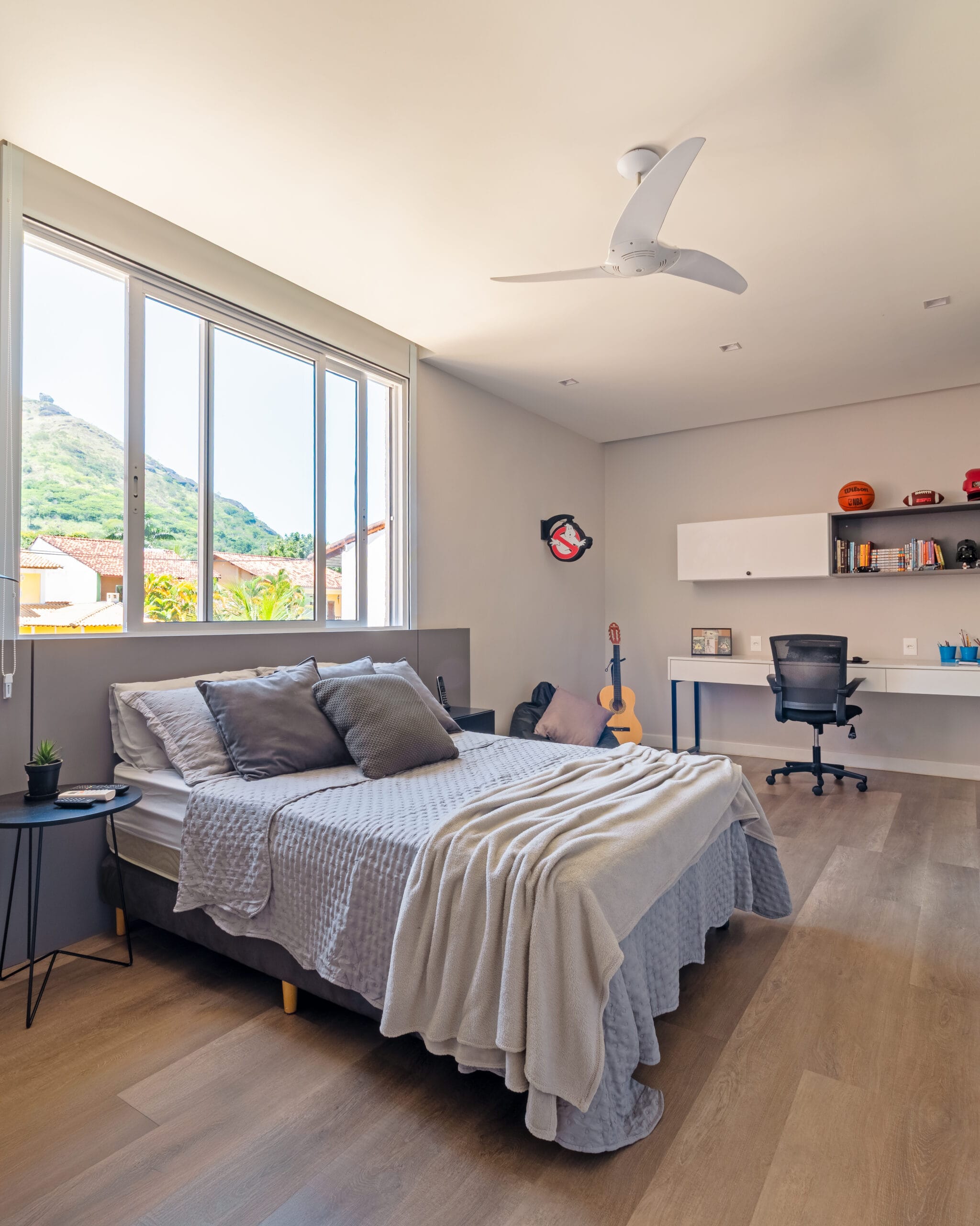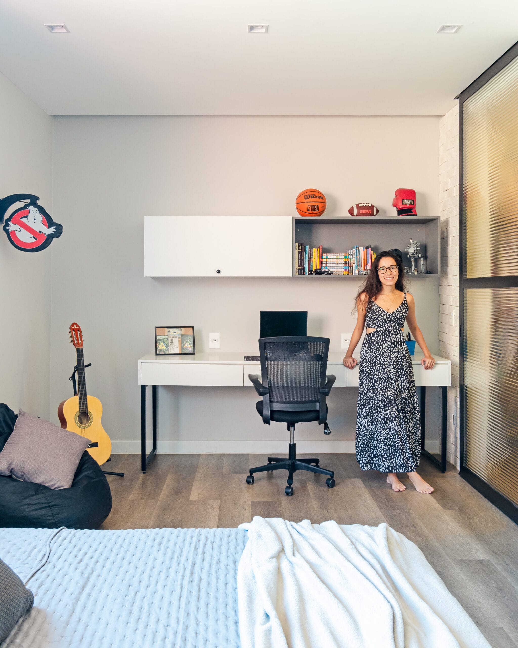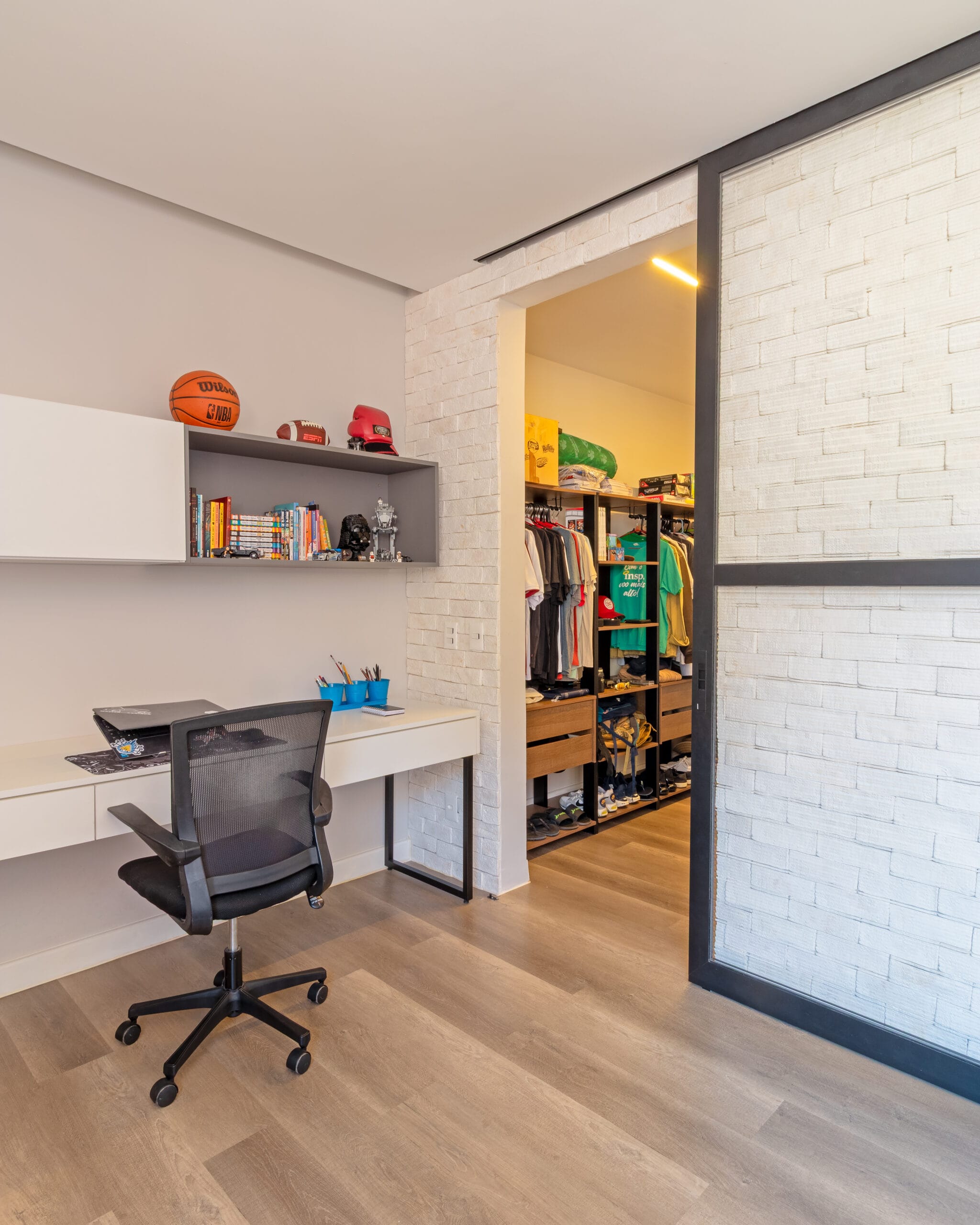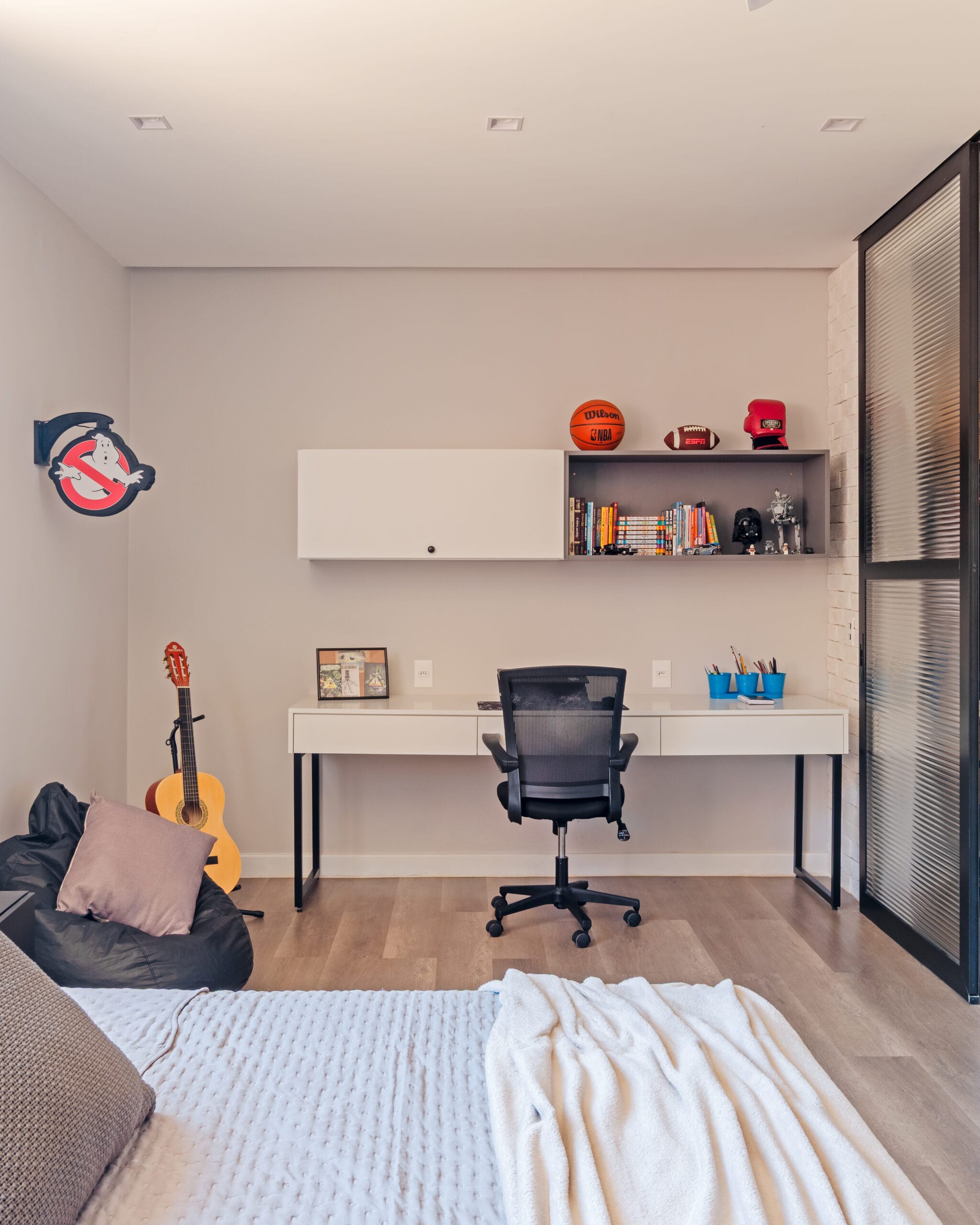 Na suíte do filho, desenvolvemos um espaço que atendesse às necessidades de um adolescente, com a flexibilidade de se adaptar quando ele se tornar um jovem adulto. O projeto incluiu um ambiente descolado, com áreas dedicadas ao estudo, ao relaxamento e à leitura. Como o cliente possui muitas esculturas de Lego para exibição, criamos prateleiras específicas para destacá-las e integrá-las ao design do ambiente.