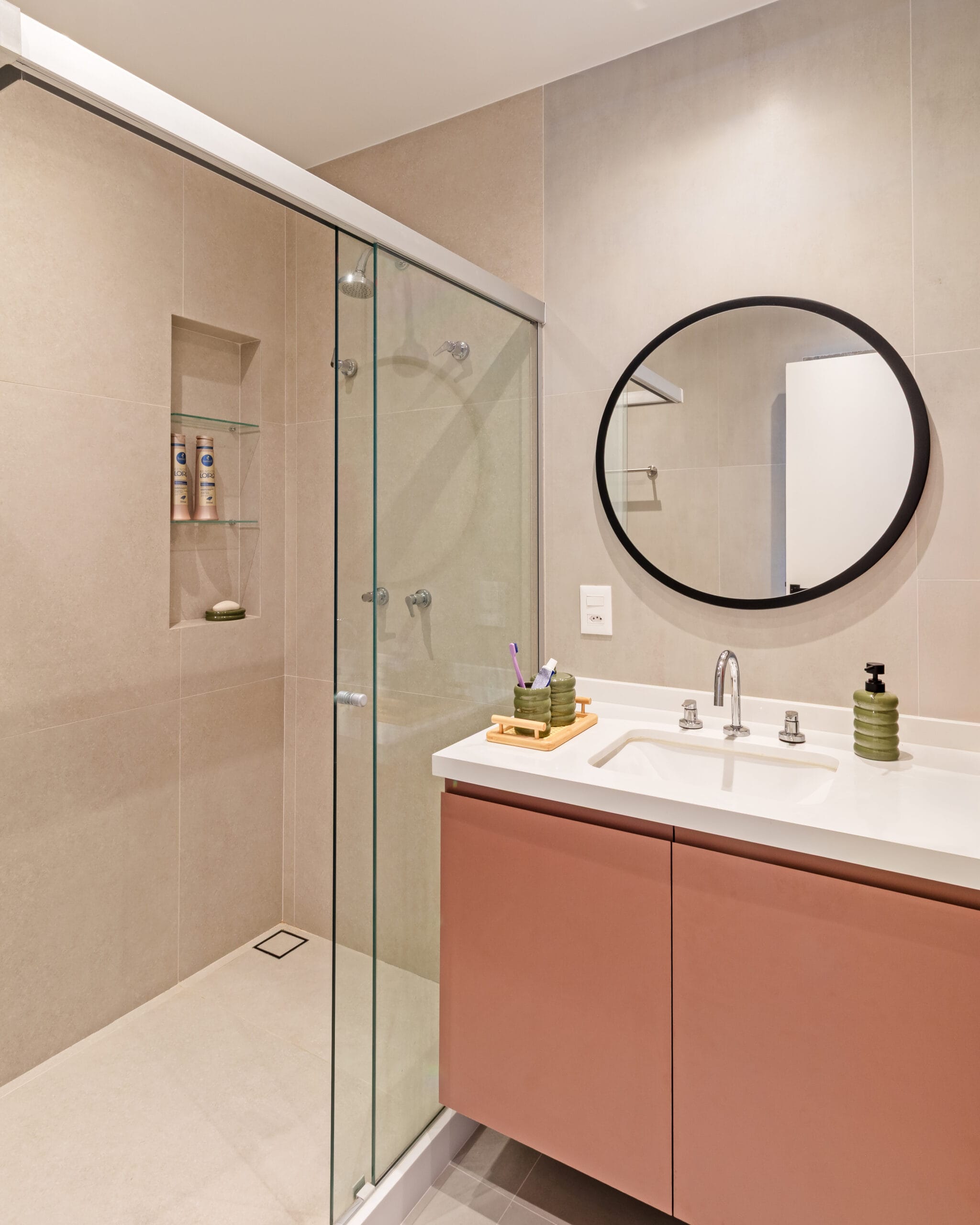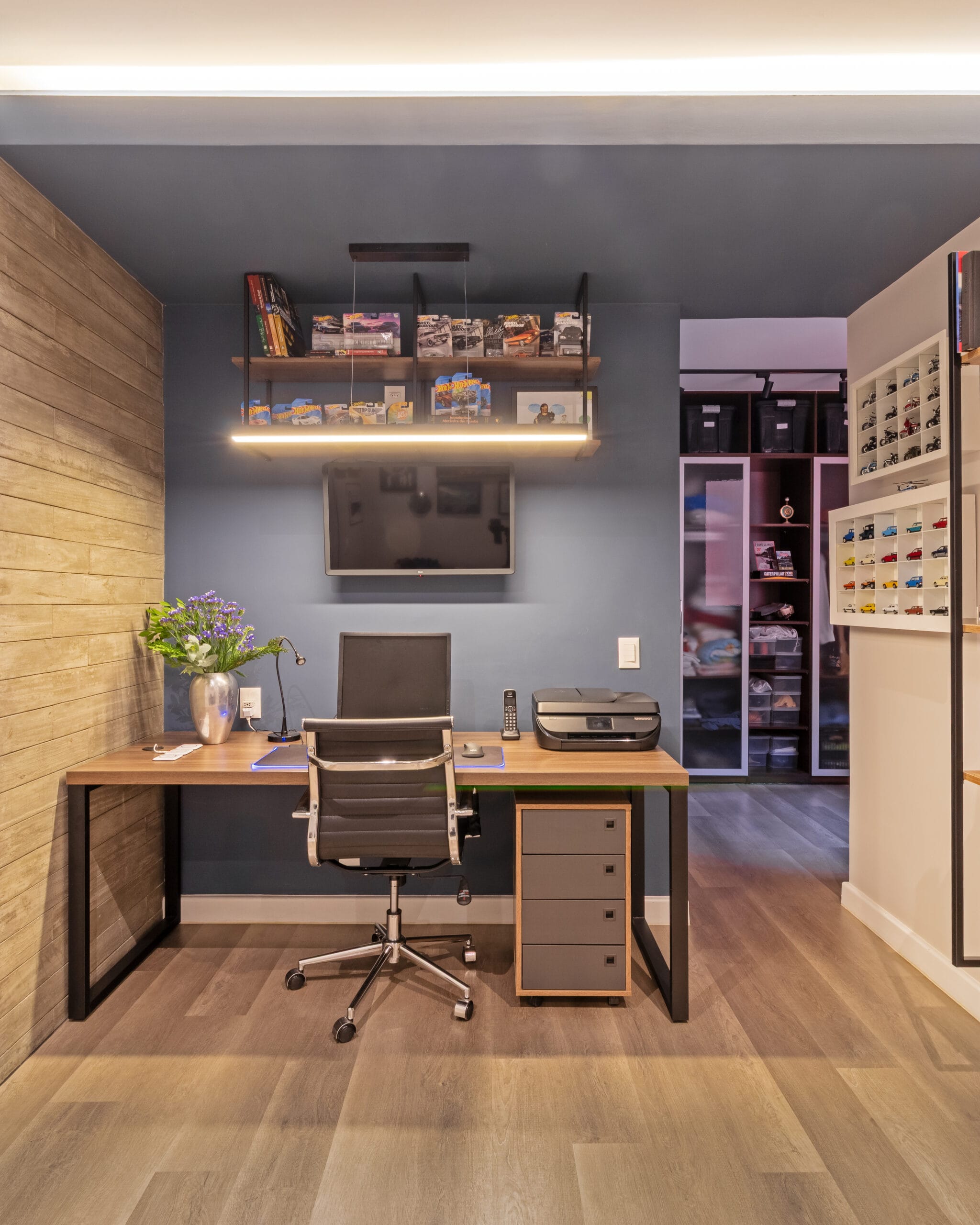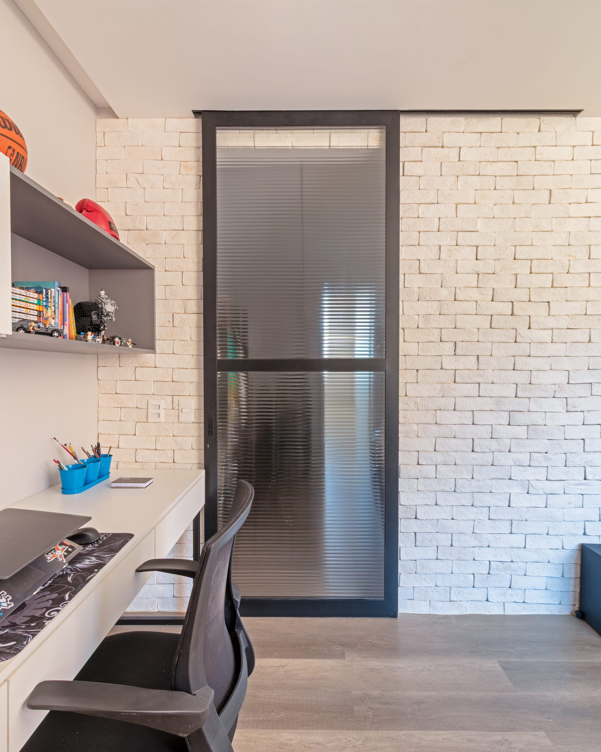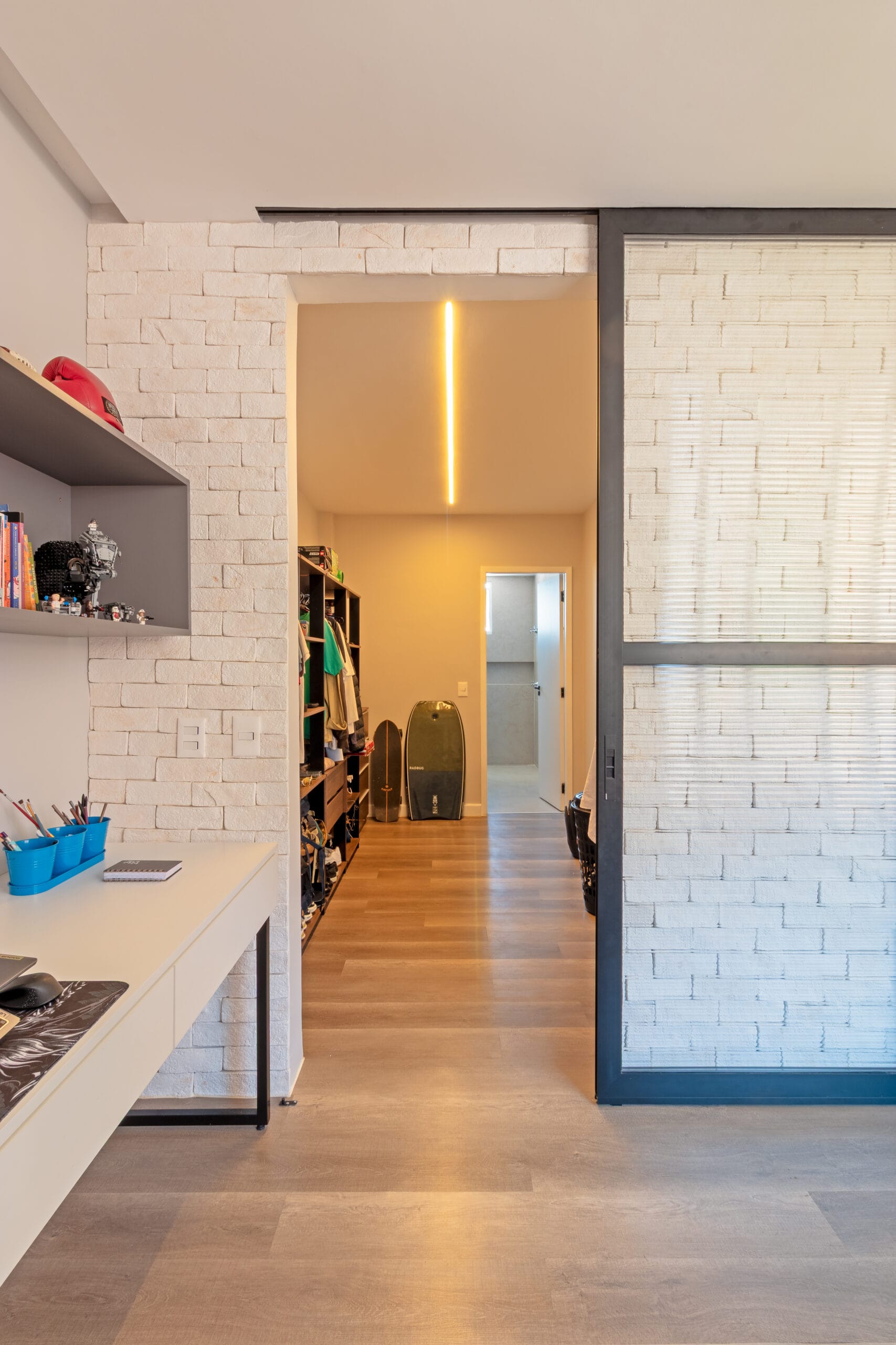 Na suíte do filho, desenvolvemos um espaço que atendesse às necessidades de um adolescente, com a flexibilidade de se adaptar quando ele se tornar um jovem adulto. O projeto incluiu um ambiente descolado, com áreas dedicadas ao estudo, ao relaxamento e à leitura. Como o cliente possui muitas esculturas de Lego para exibição, criamos prateleiras específicas para destacá-las e integrá-las ao design do ambiente.
