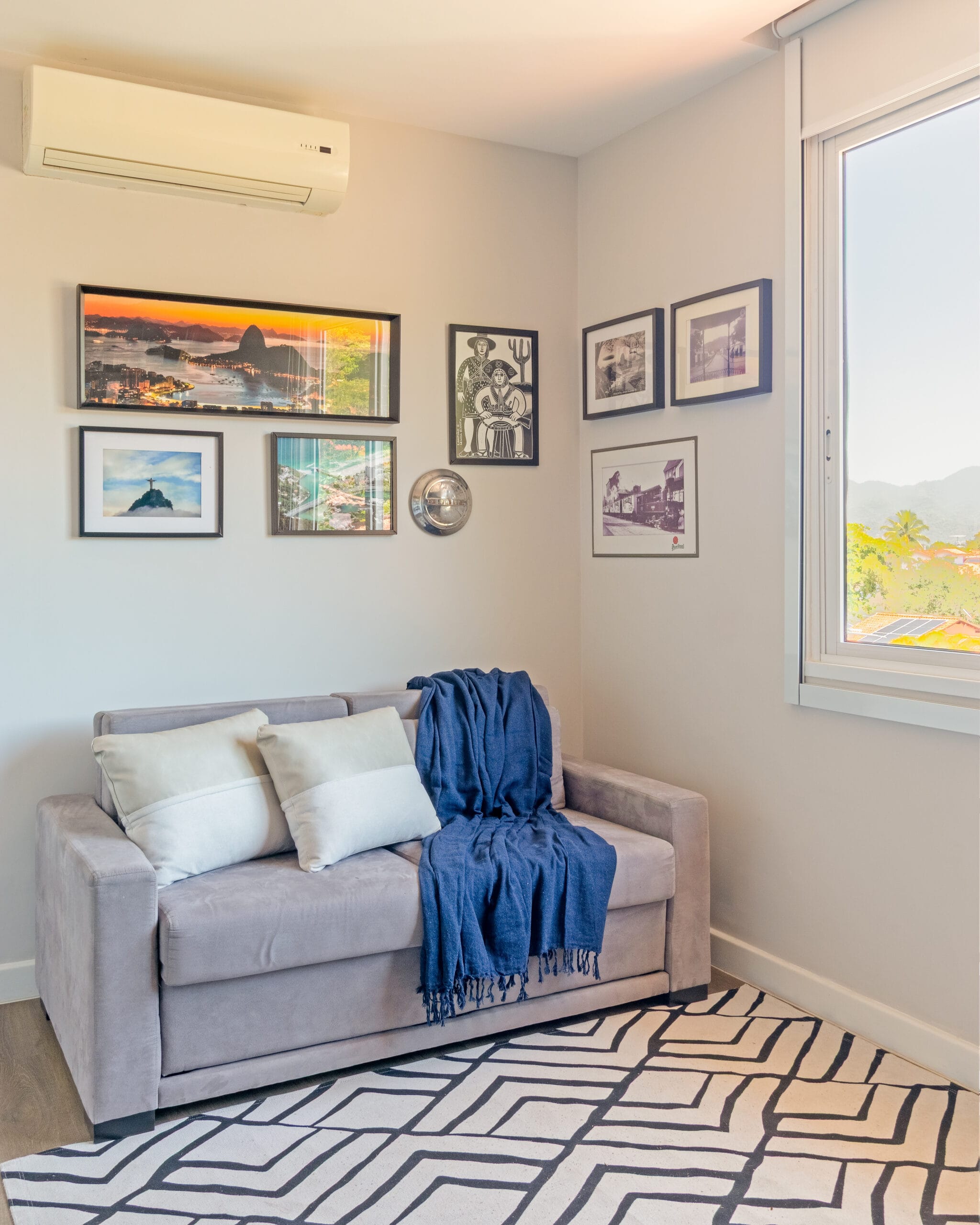 Para o escritório, reaproveitamos o sofá-cama existente, garantindo uma solução prática e confortável para visitas. Novamente, optamos por móveis prontos e econômicos, mantendo o espaço funcional e bem organizado.