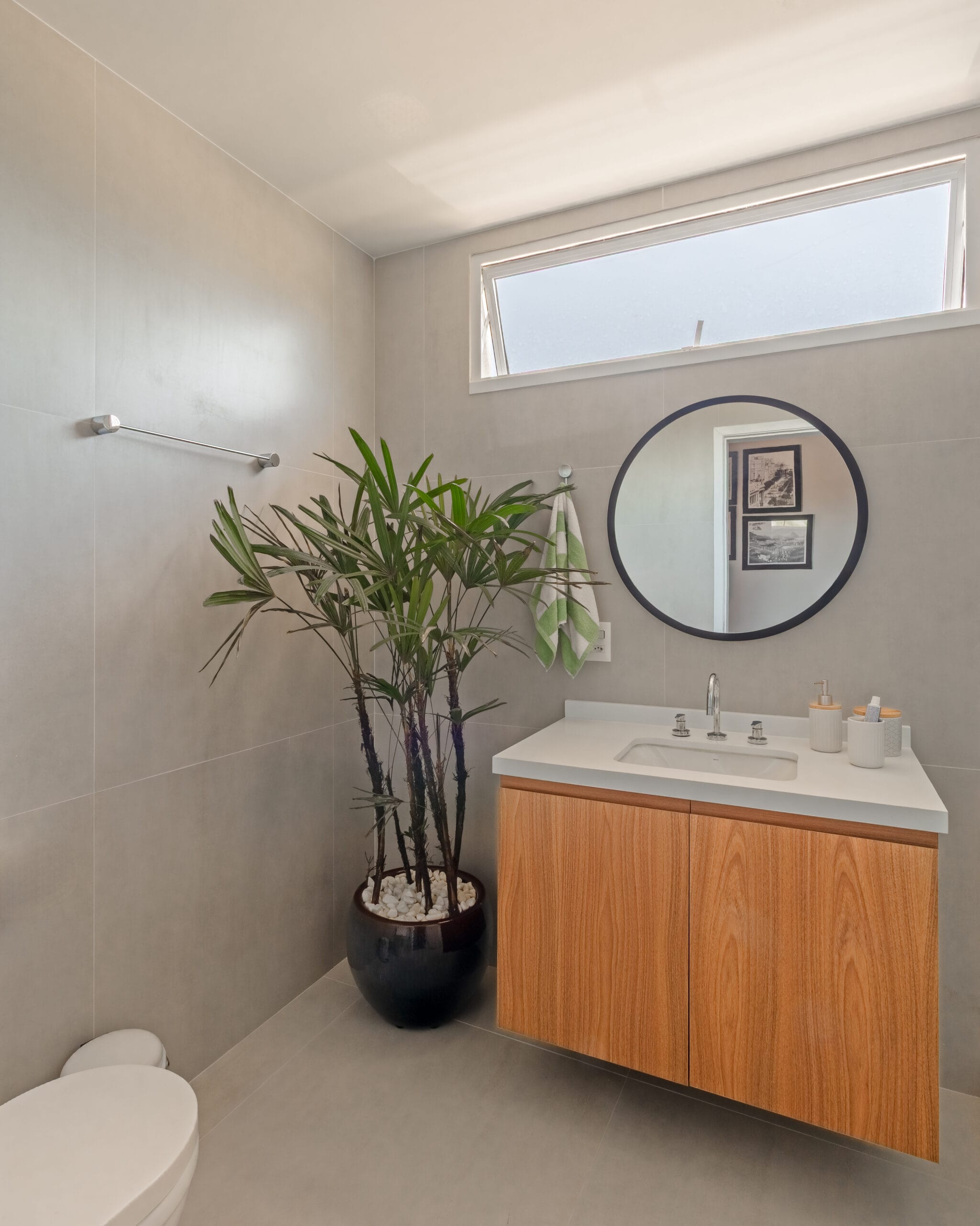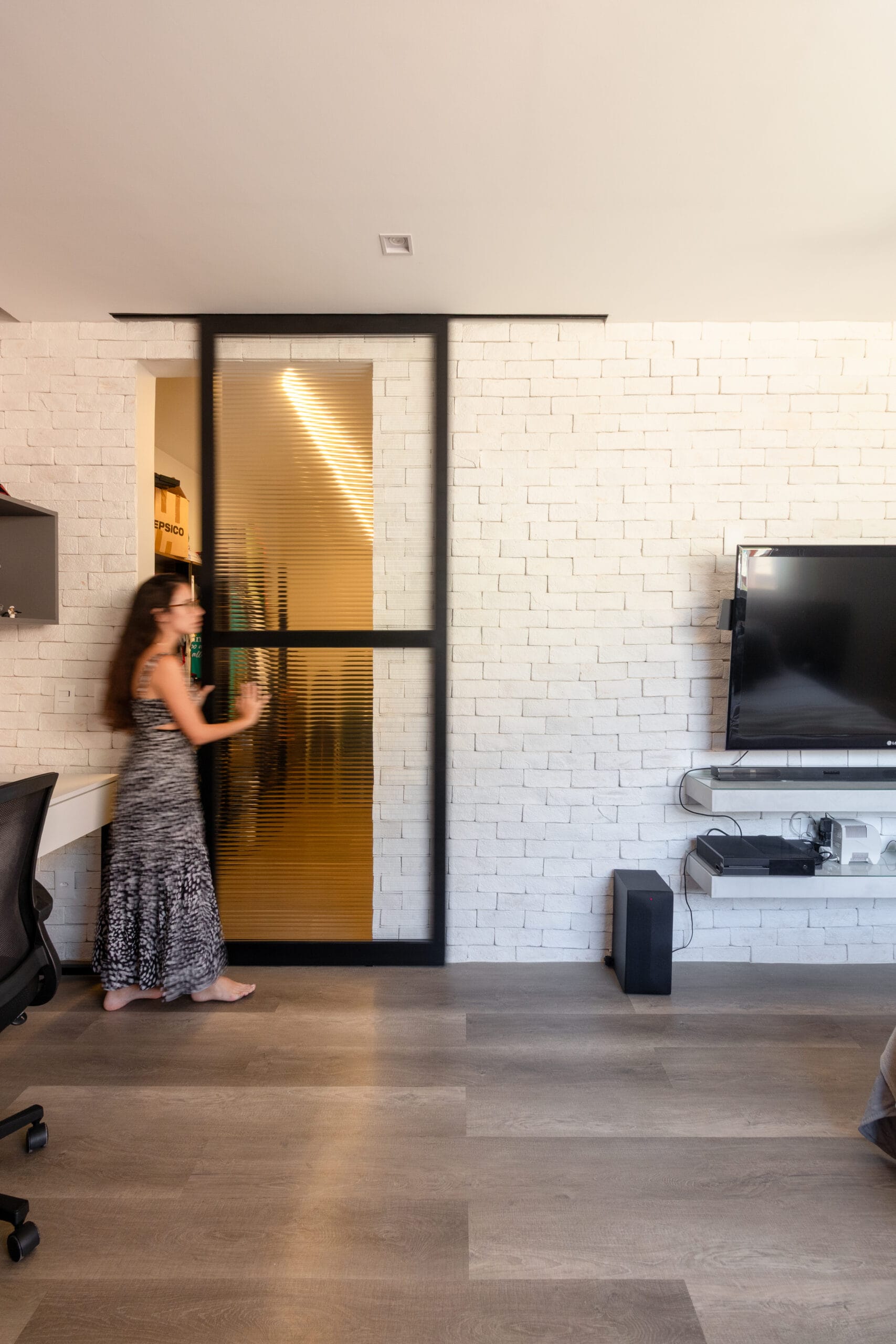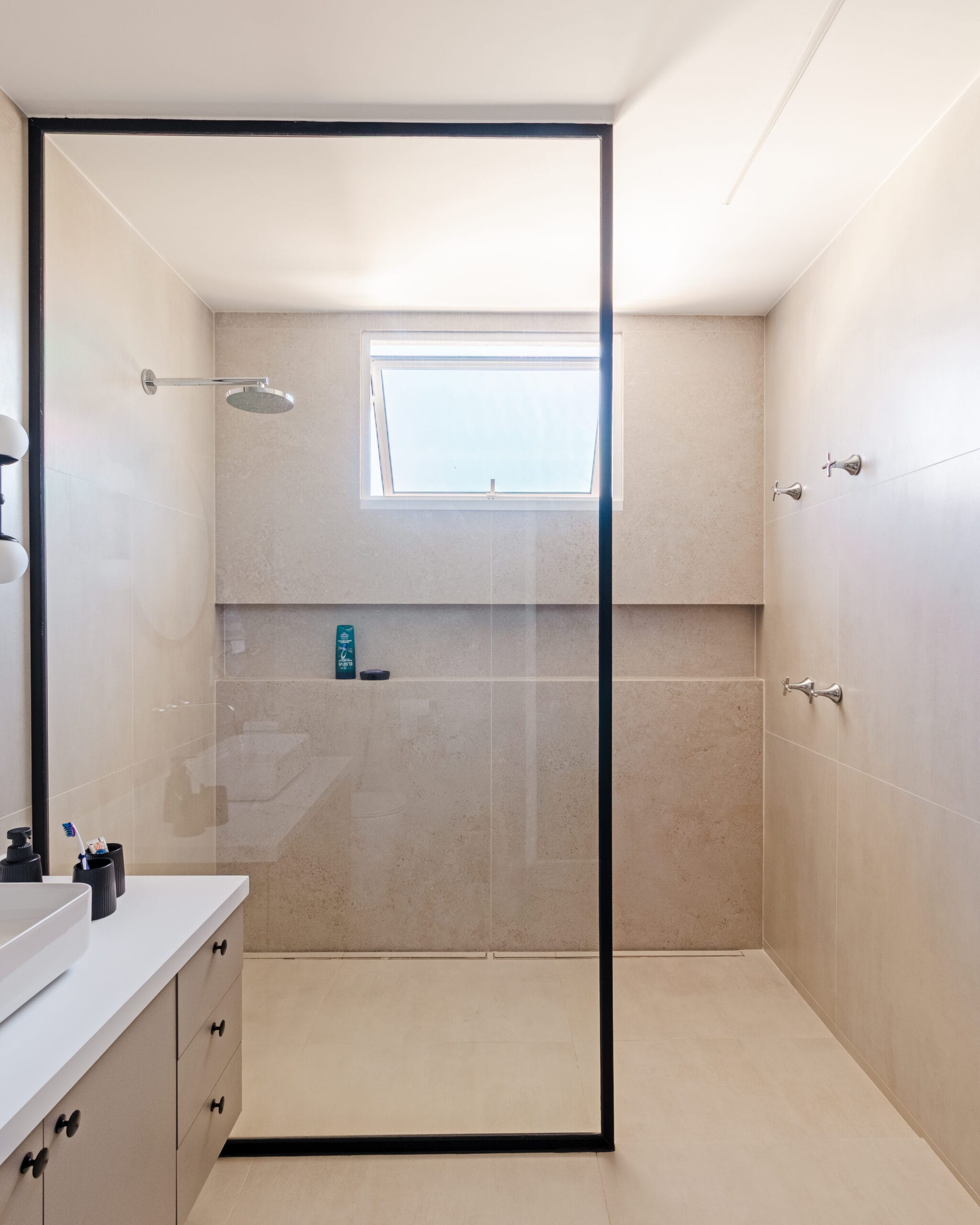 Os clientes nos chamaram para reformar outra parte da casa, focando em três suítes: a do filho, a de hóspedes e o escritório. A premissa para todas as suítes foi o uso de piso vinílico, garantindo conforto e praticidade. Além disso, todas as janelas foram trocadas pela mesma linha já utilizada na cozinha, que oferece melhorias térmicas e acústicas.