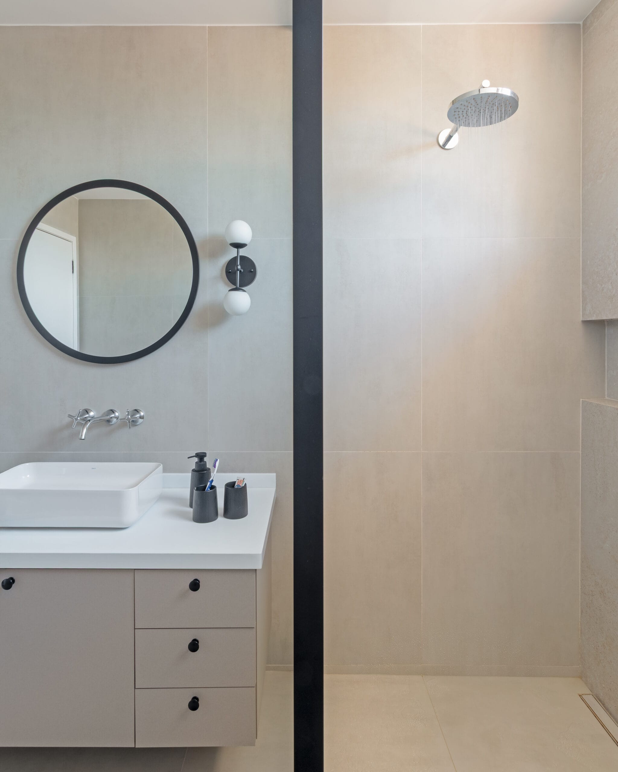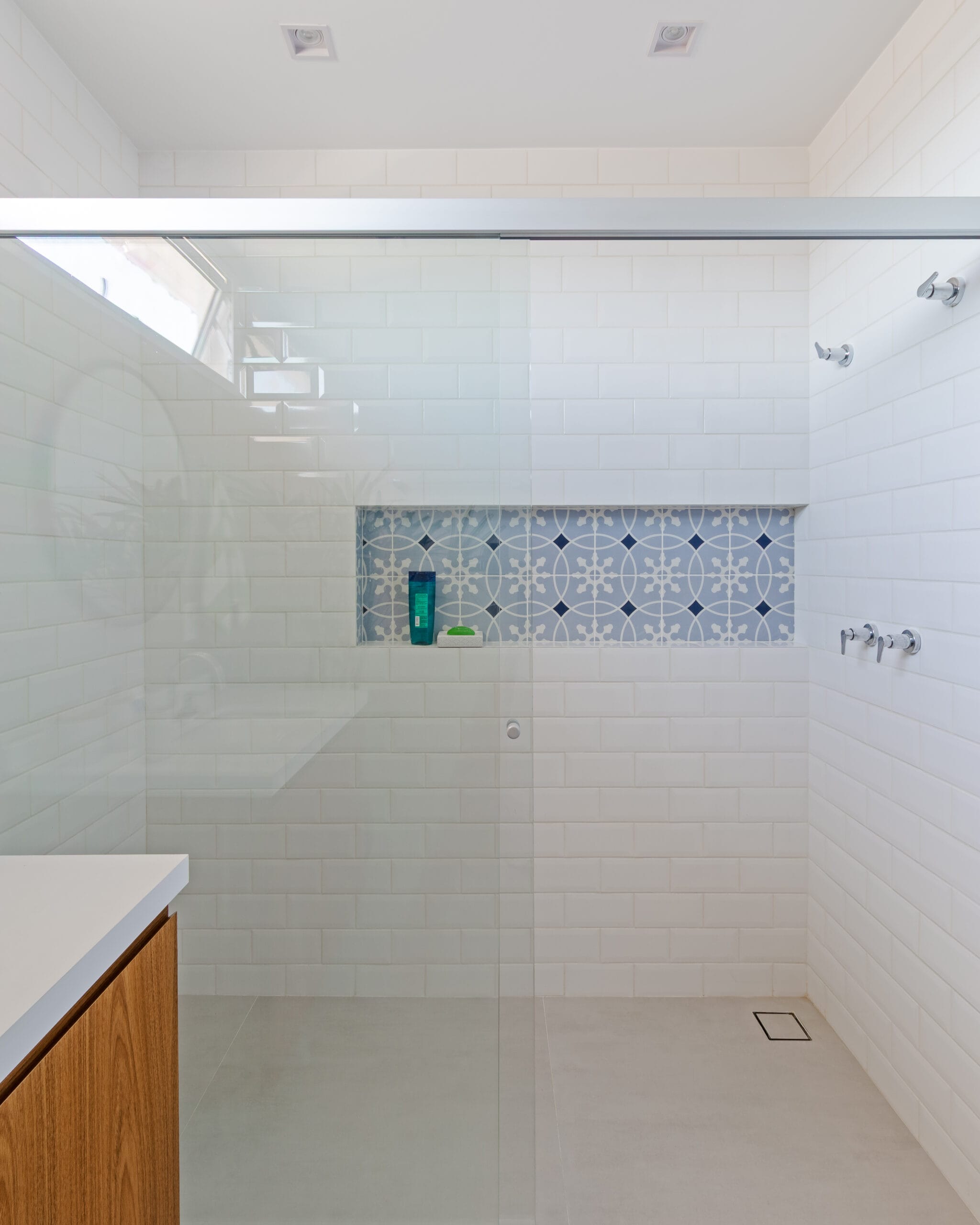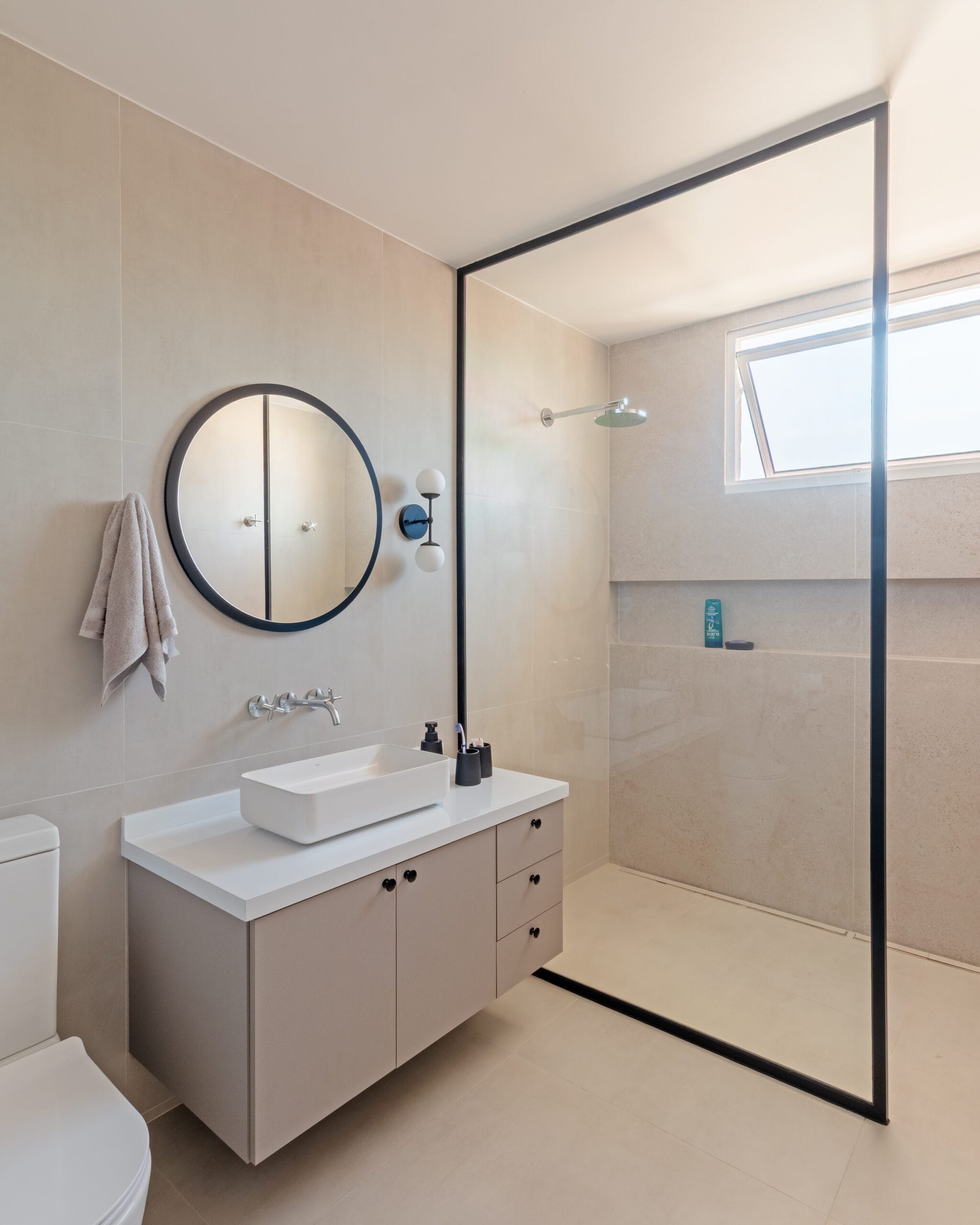 Os clientes nos chamaram para reformar outra parte da casa, focando em três suítes: a do filho, a de hóspedes e o escritório. A premissa para todas as suítes foi o uso de piso vinílico, garantindo conforto e praticidade. Além disso, todas as janelas foram trocadas pela mesma linha já utilizada na cozinha, que oferece melhorias térmicas e acústicas.
