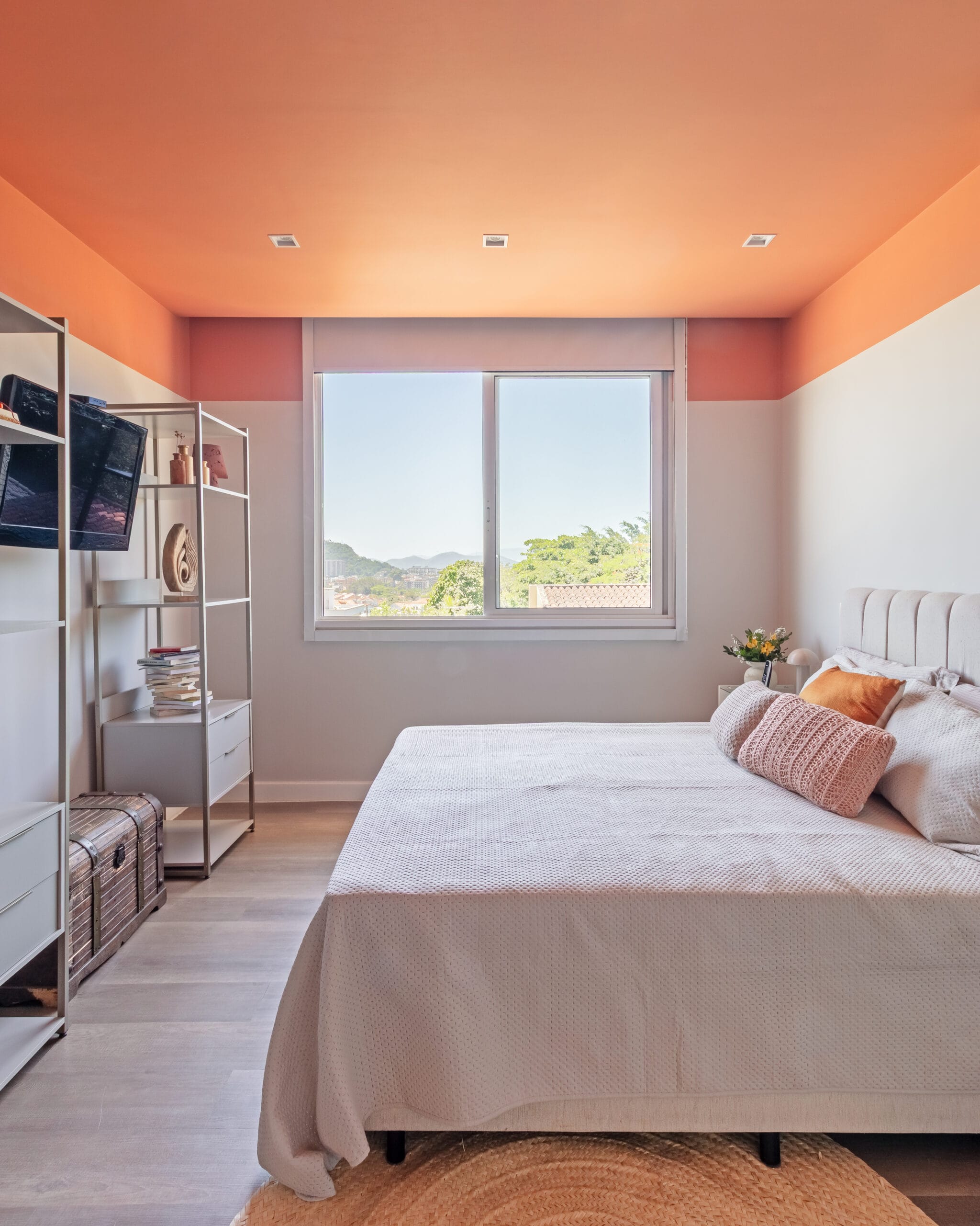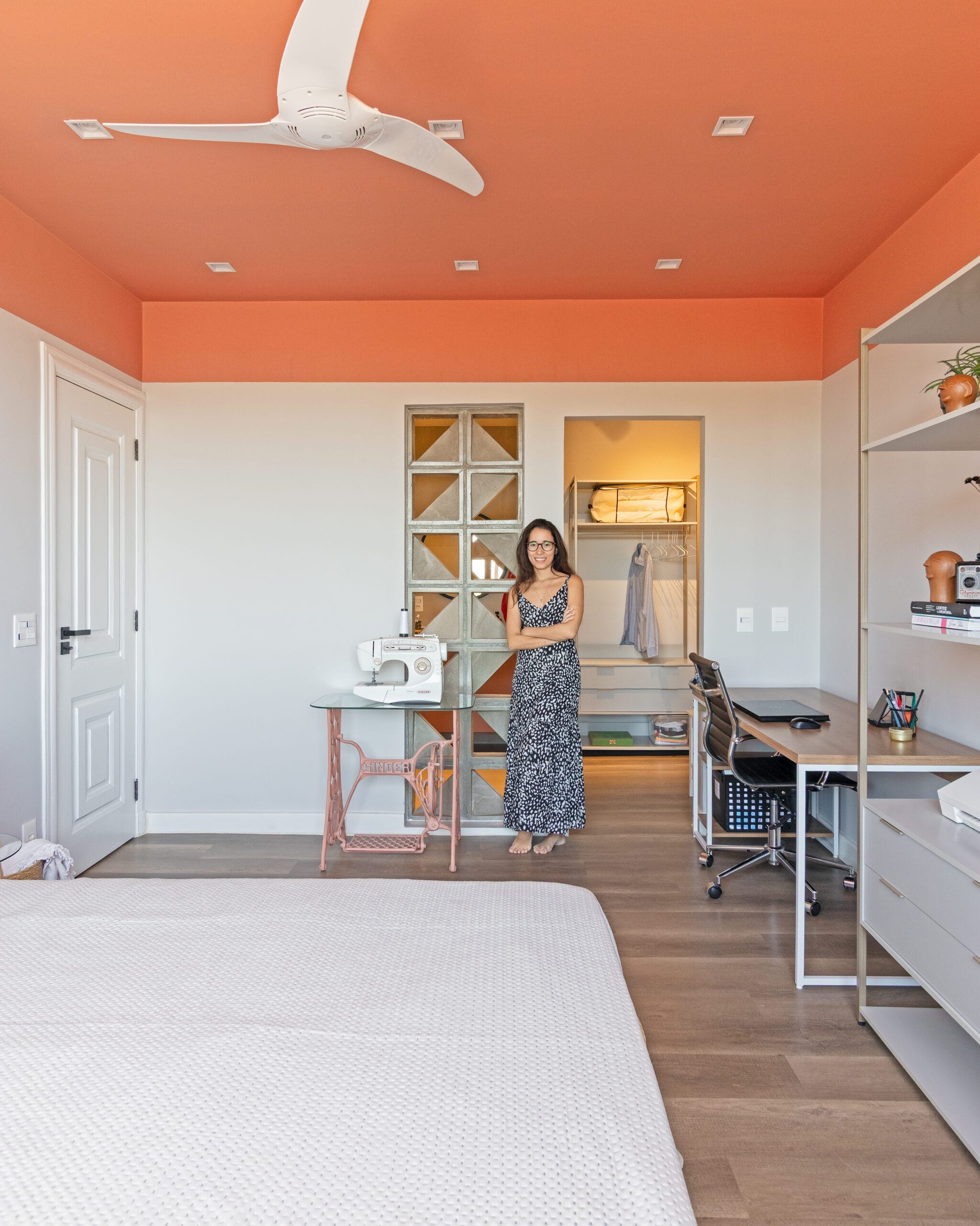 Na suíte de hóspedes, criamos um ambiente acolhedor e funcional, incorporando um espaço de ateliê para a esposa. Utilizamos móveis comprados prontos e com bom custo-benefício para otimizar o projeto sem comprometer a qualidade.