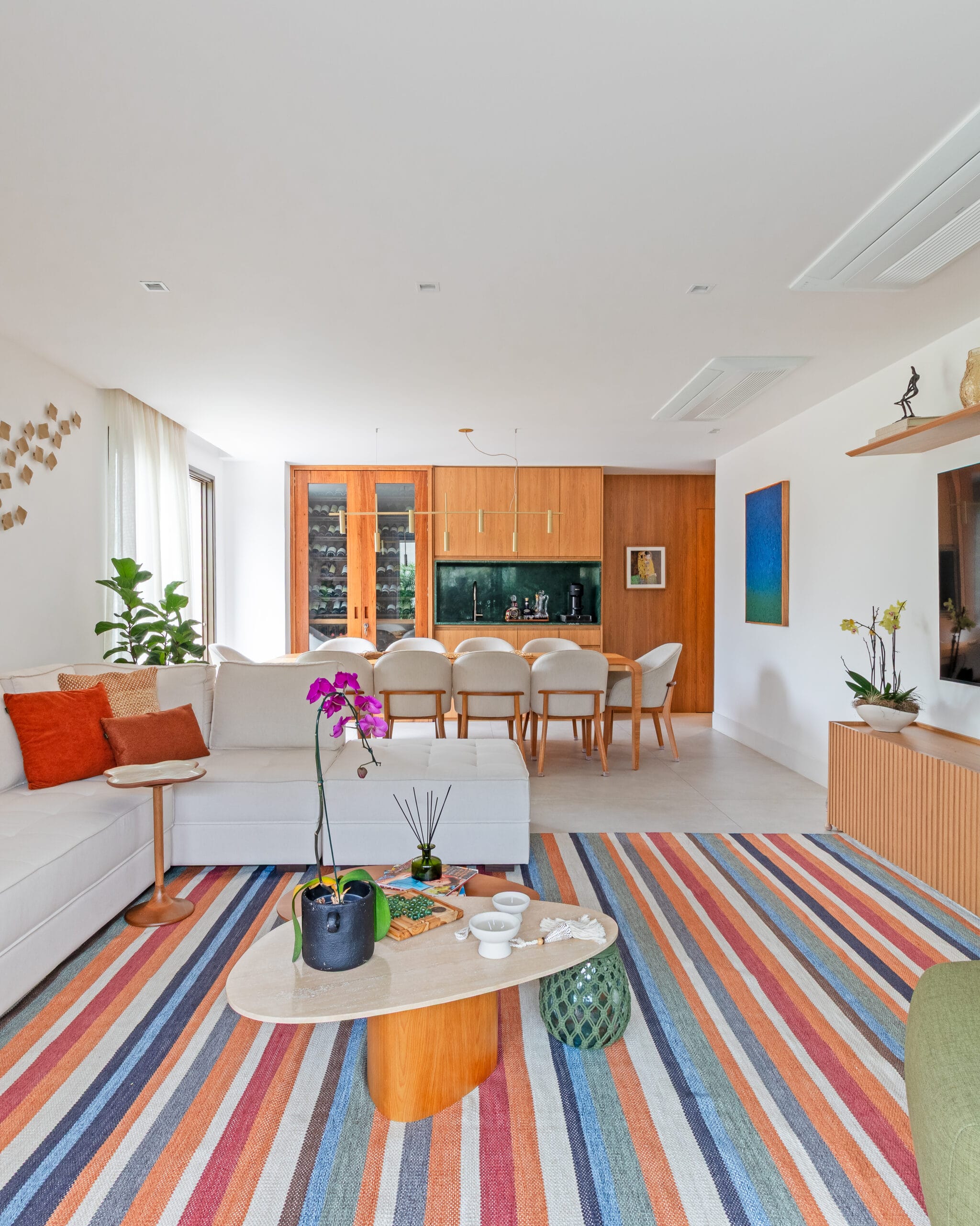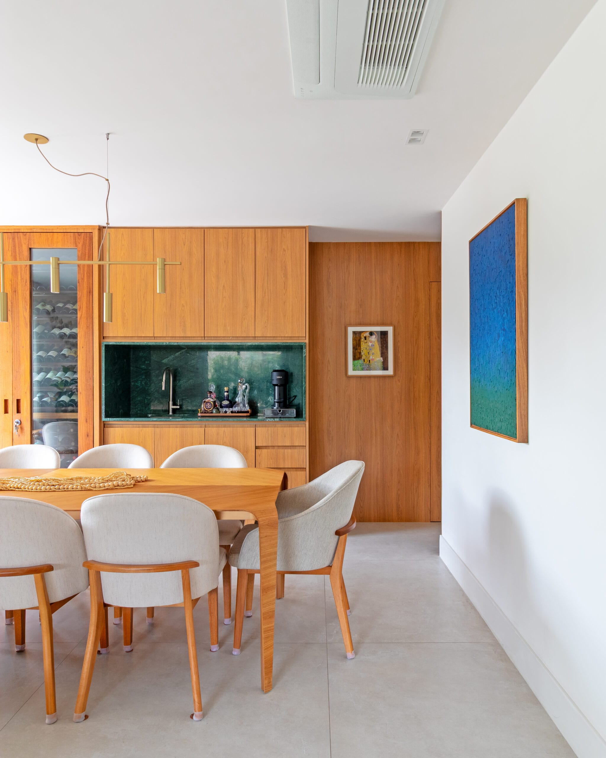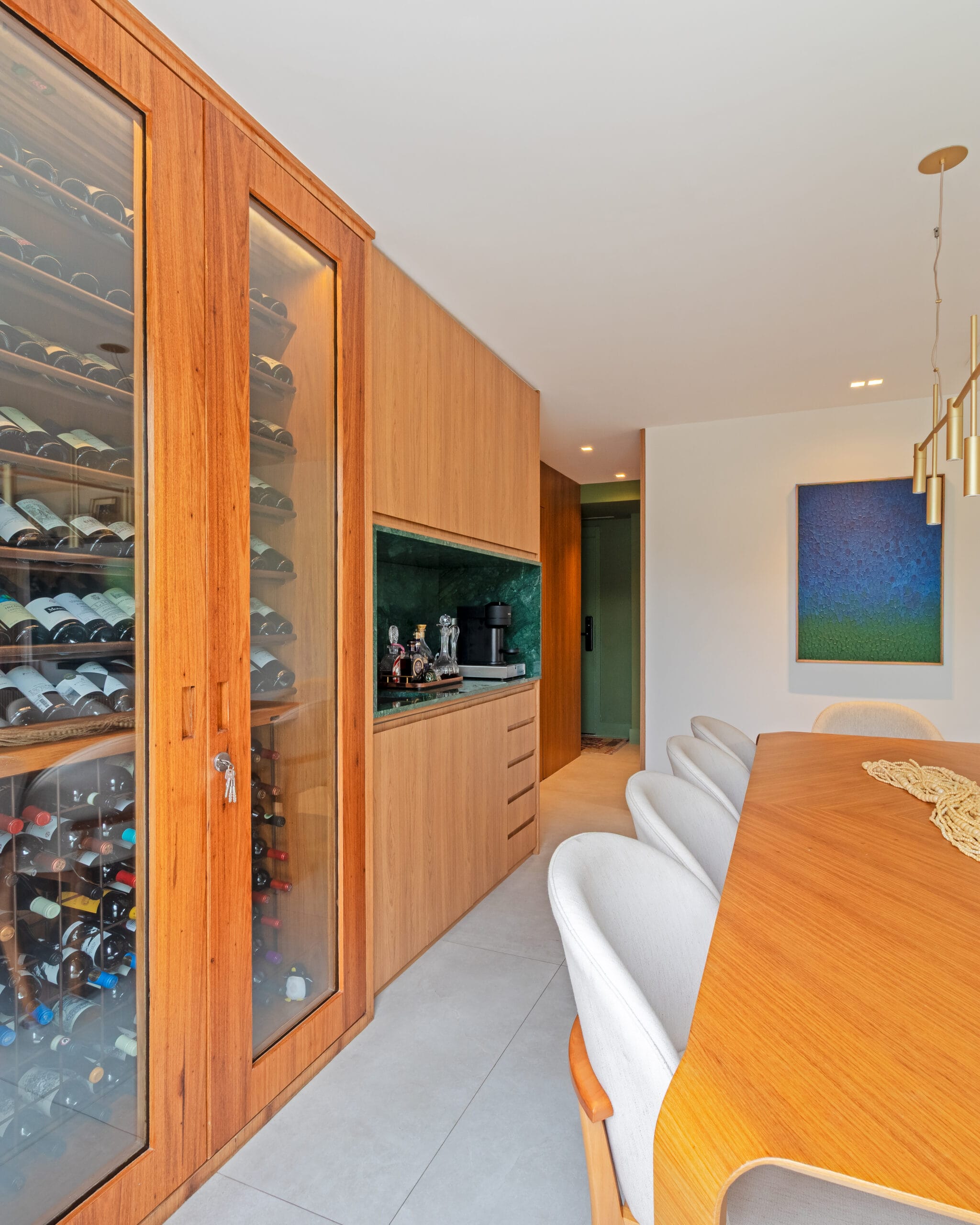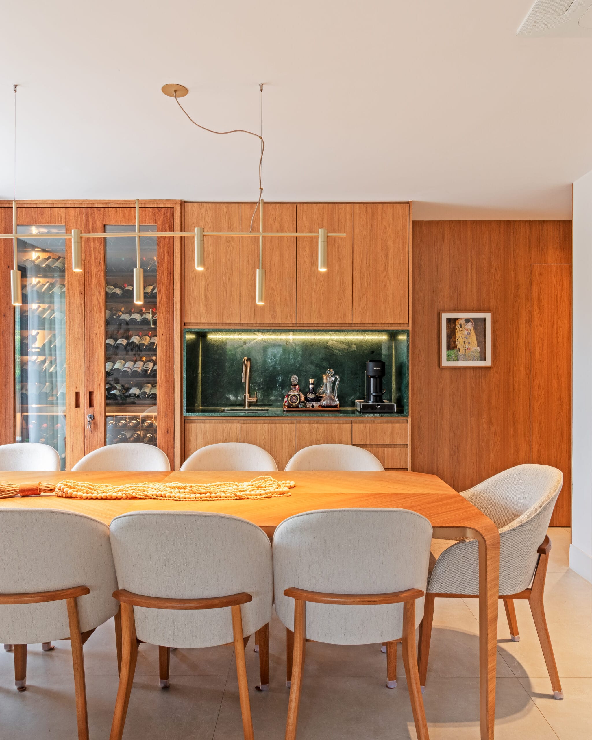 A sala de estar e jantar se configura como o ponto focal do apartamento. O espaço abriga uma adega climatizada integrada a uma área de bar de apoio, além de uma mesa para até 10 pessoas, perfeita para receber e um grande e confortável sofá em “L”, que convida ao convívio prolongado.