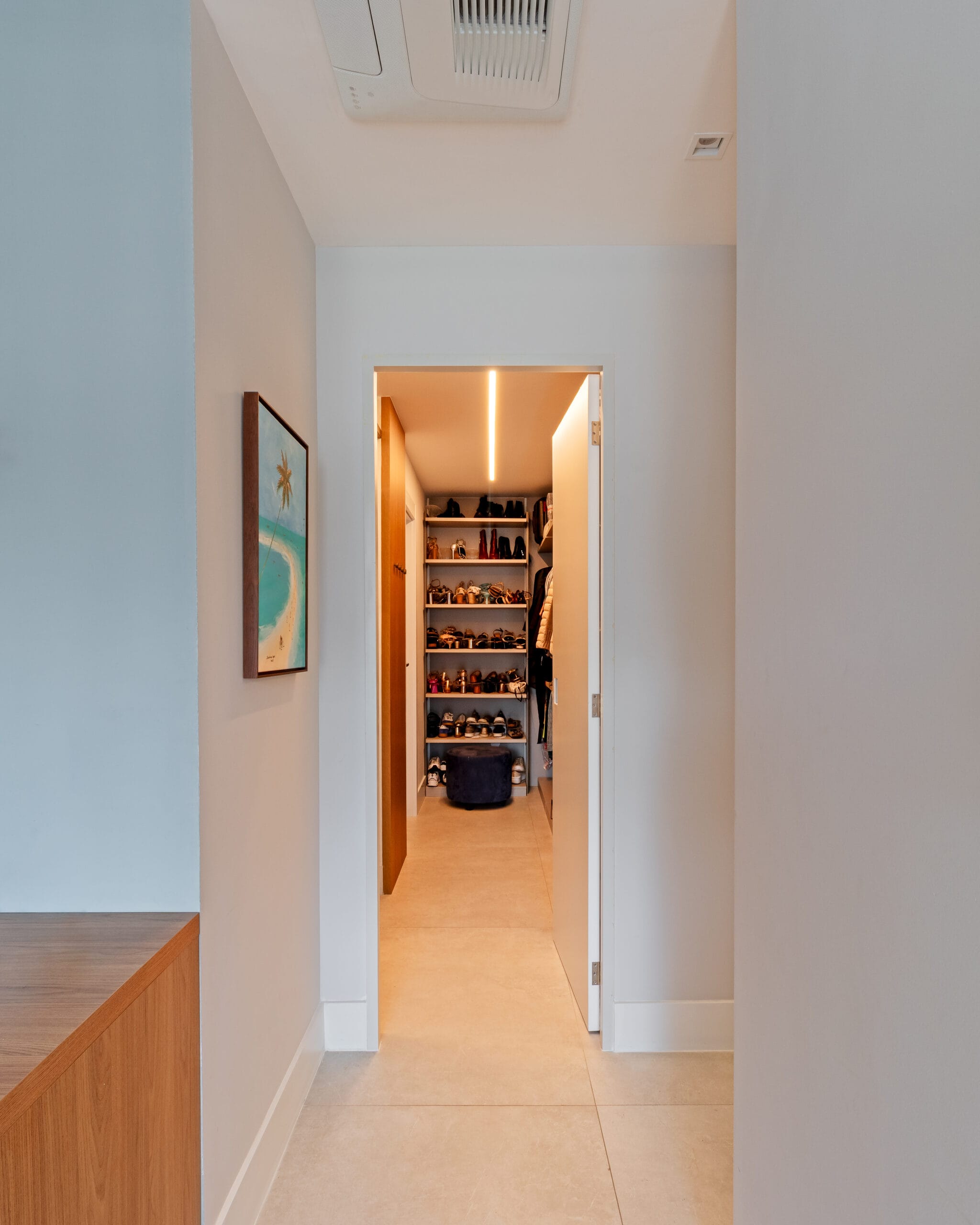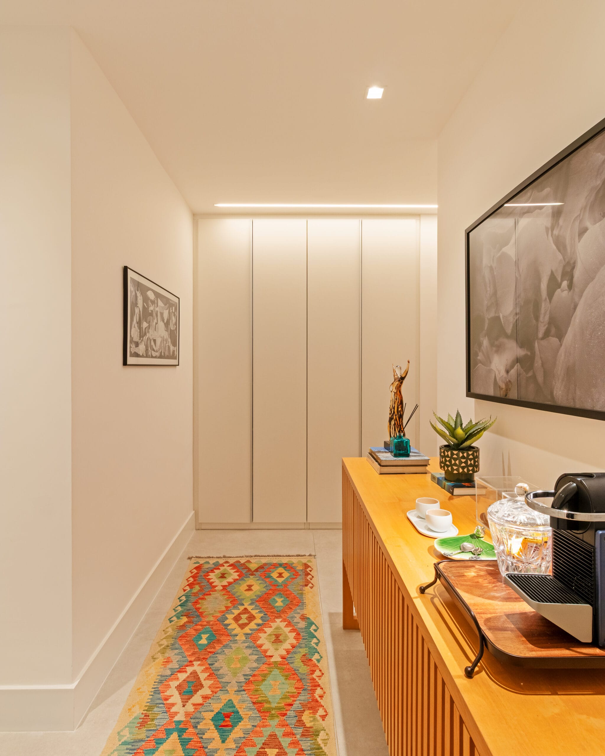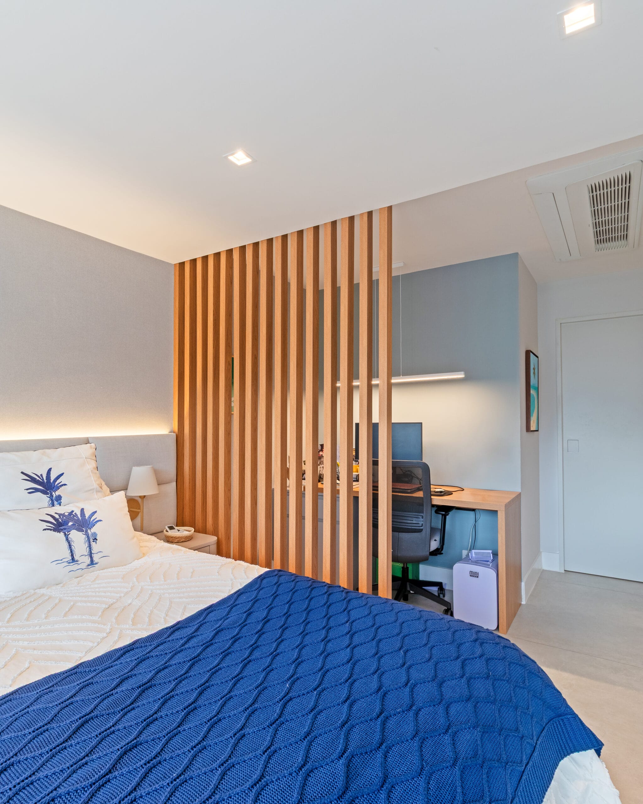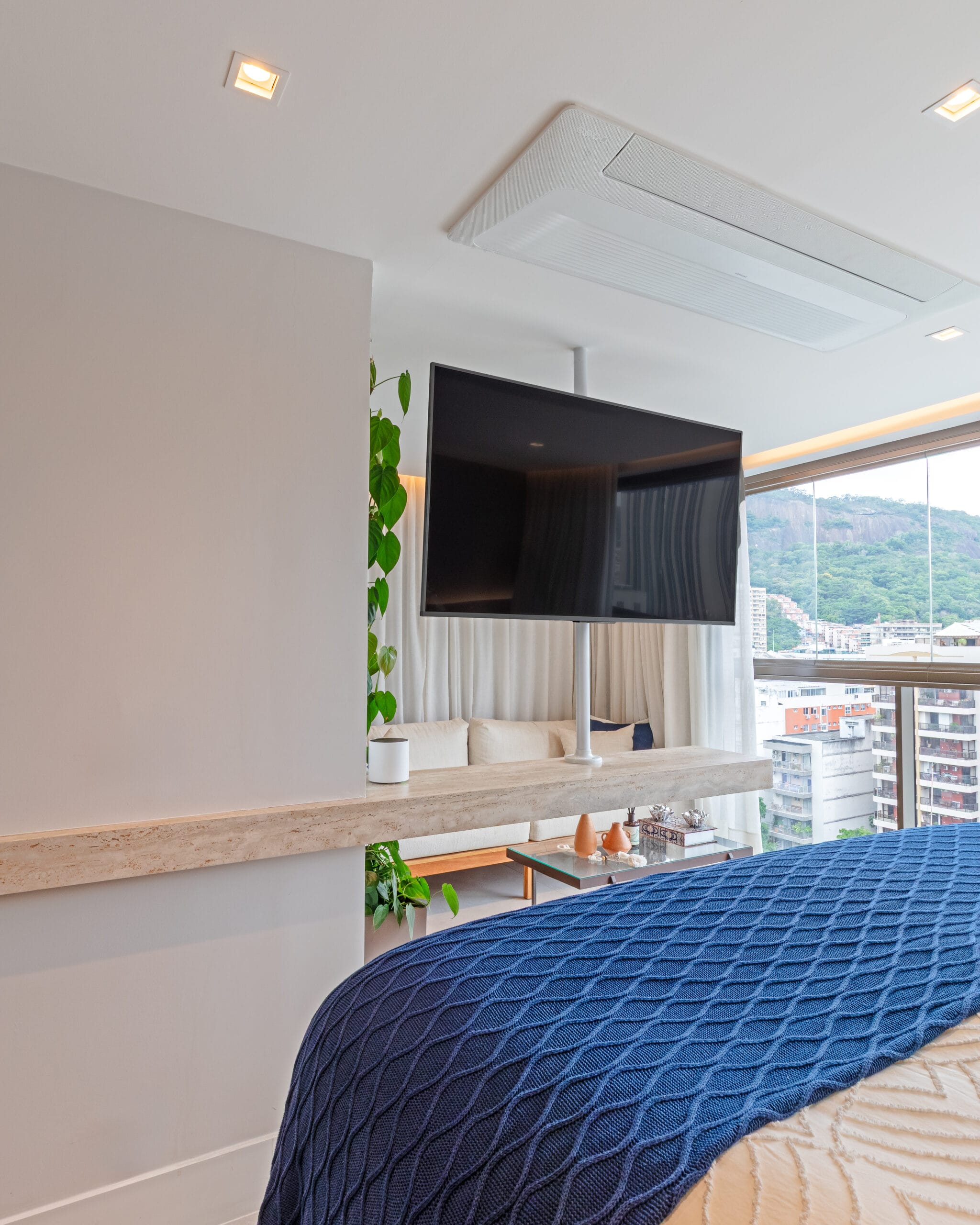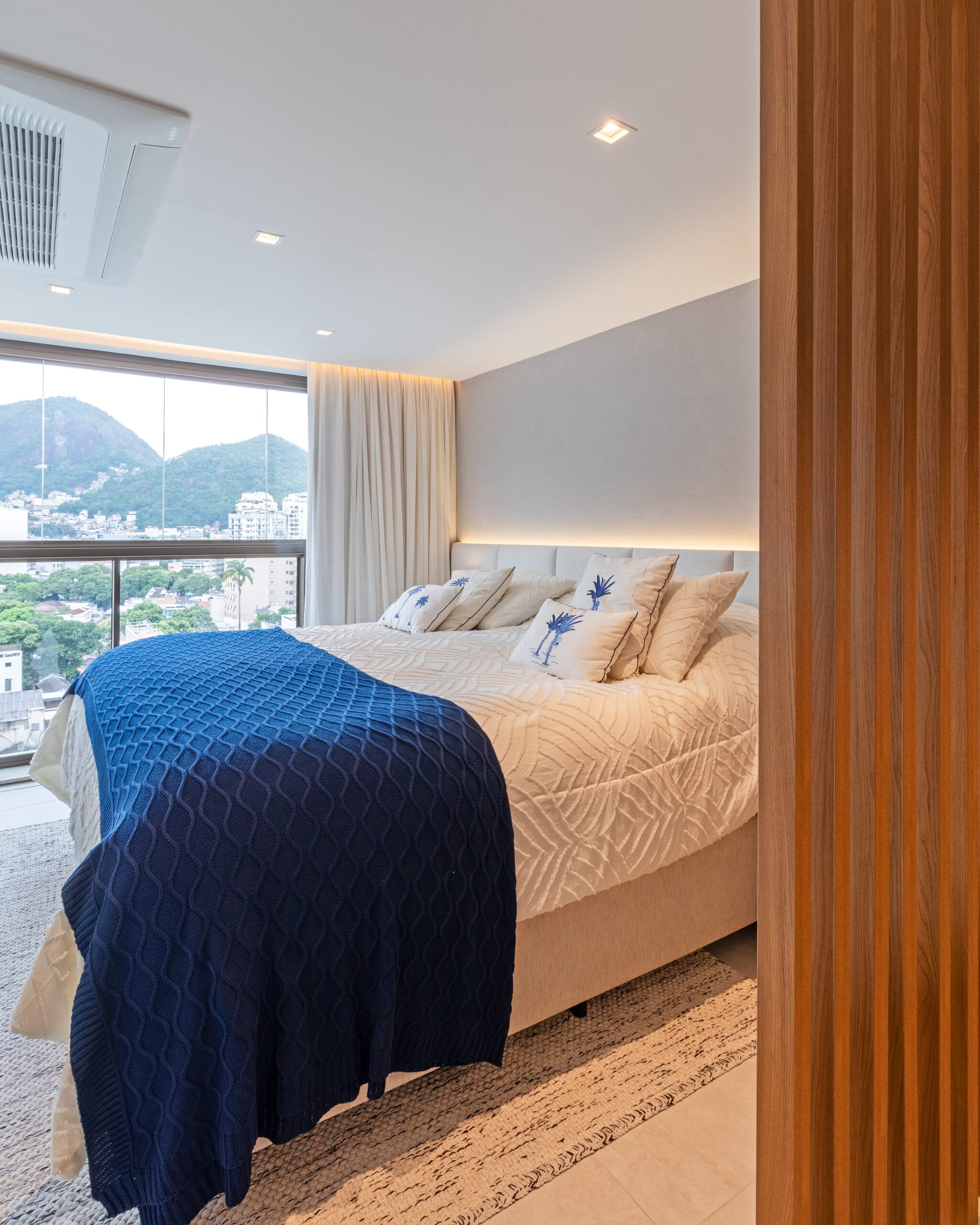 Na área íntima, criamos um verdadeiro refúgio para o casal a partir da unificação de duas suítes e da antiga varanda íntima. O novo layout contempla um amplo closet, banheiros independentes para ele e para ela, um escritório individual para cada um e uma área de estar com vista privilegiada para o Cristo. O resultado é uma suíte com atmosfera e conforto de hotel, pensada para o descanso e o bem-estar.