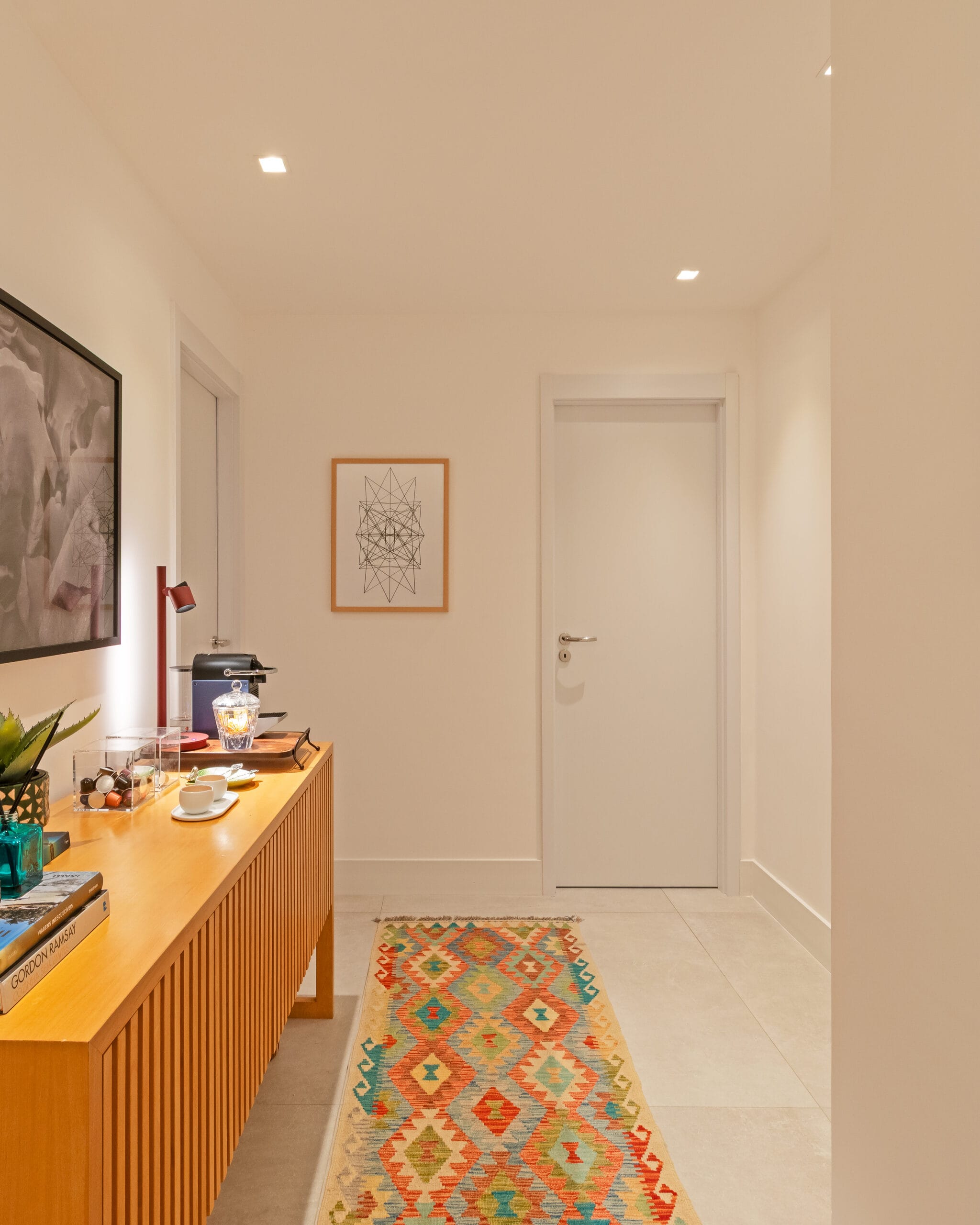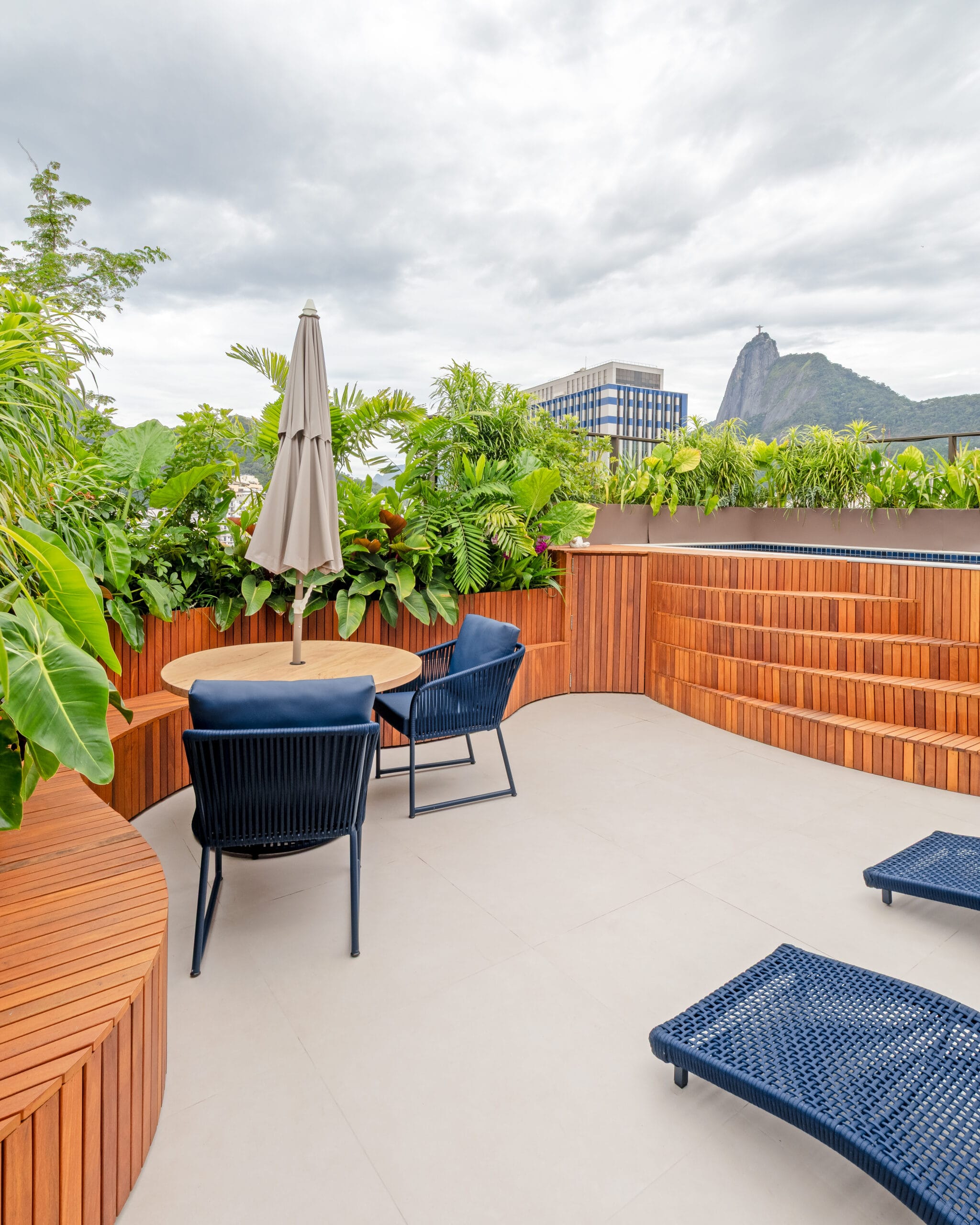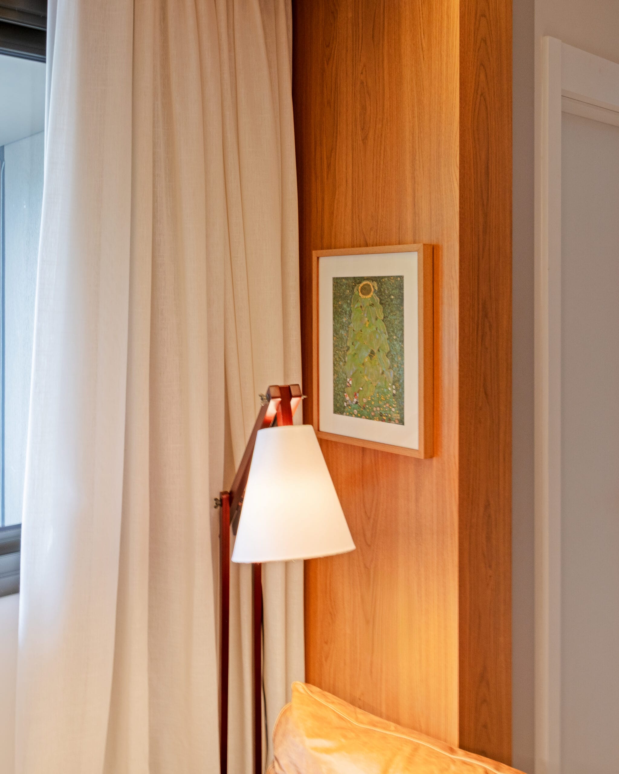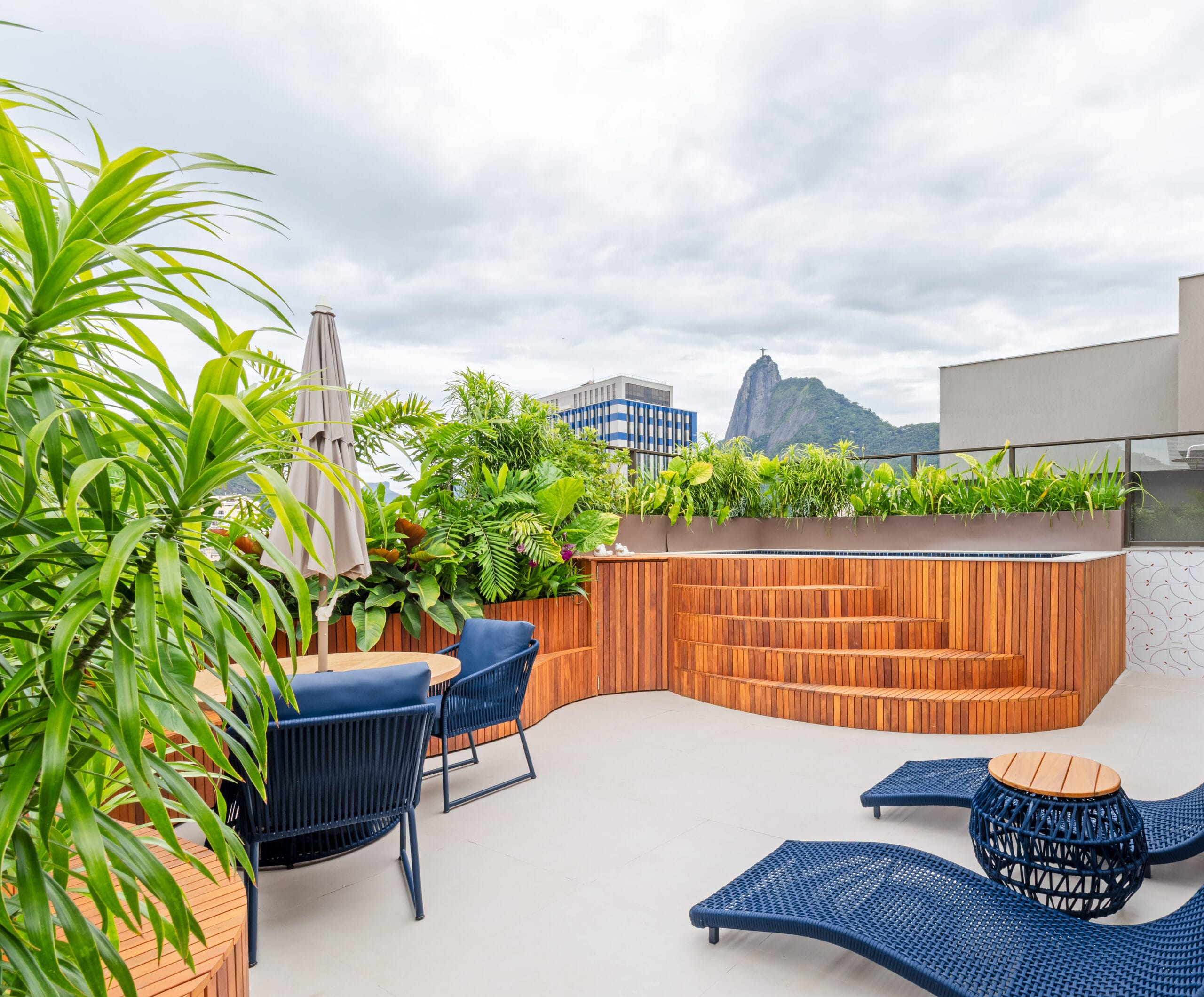 Na área íntima, criamos um verdadeiro refúgio para o casal a partir da unificação de duas suítes e da antiga varanda íntima. O novo layout contempla um amplo closet, banheiros independentes para ele e para ela, um escritório individual para cada um e uma área de estar com vista privilegiada para o Cristo. O resultado é uma suíte com atmosfera e conforto de hotel, pensada para o descanso e o bem-estar.
