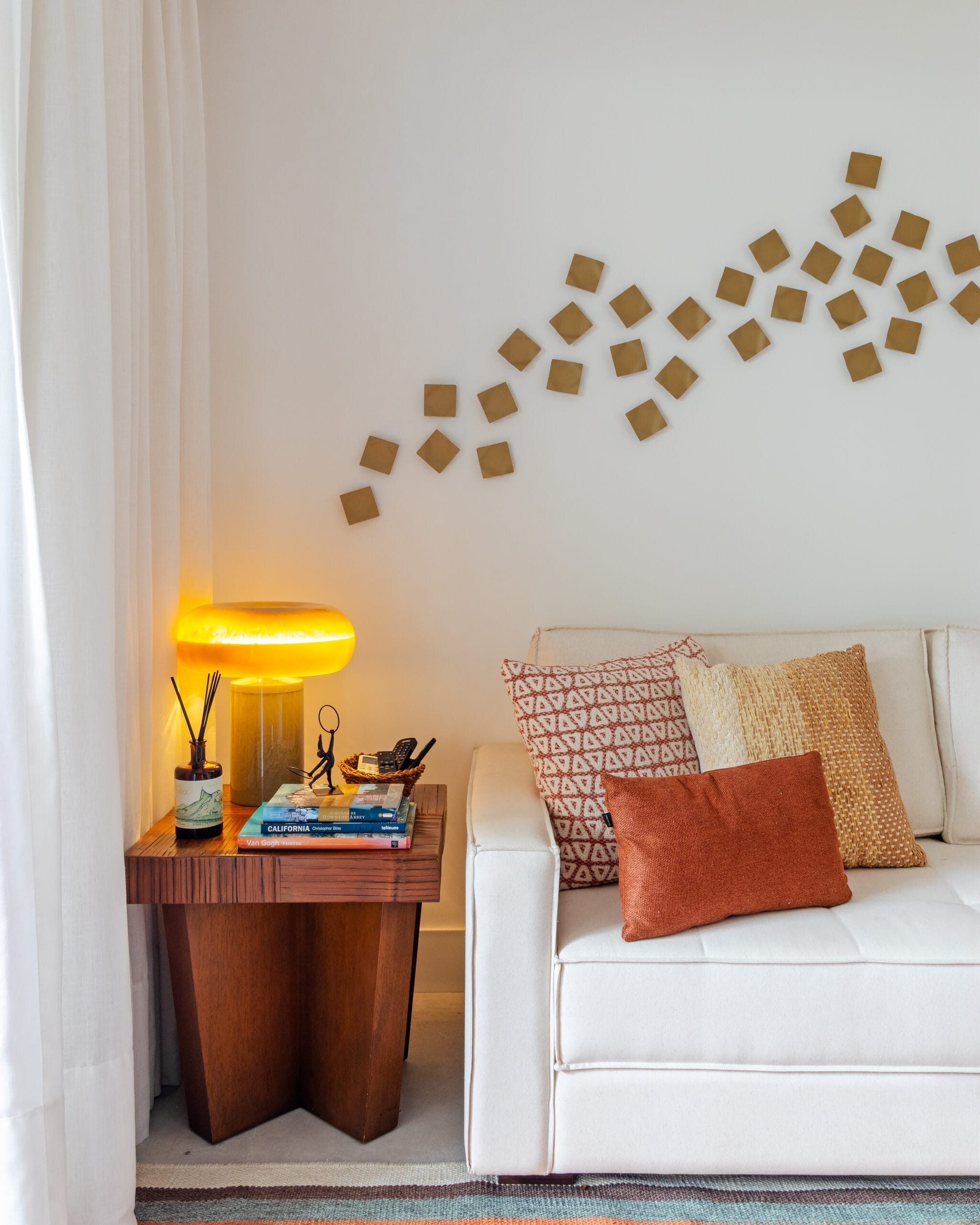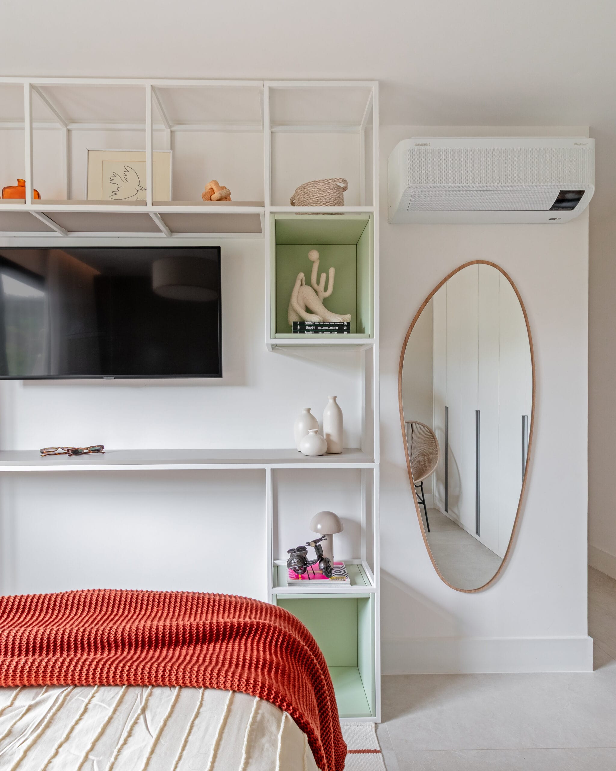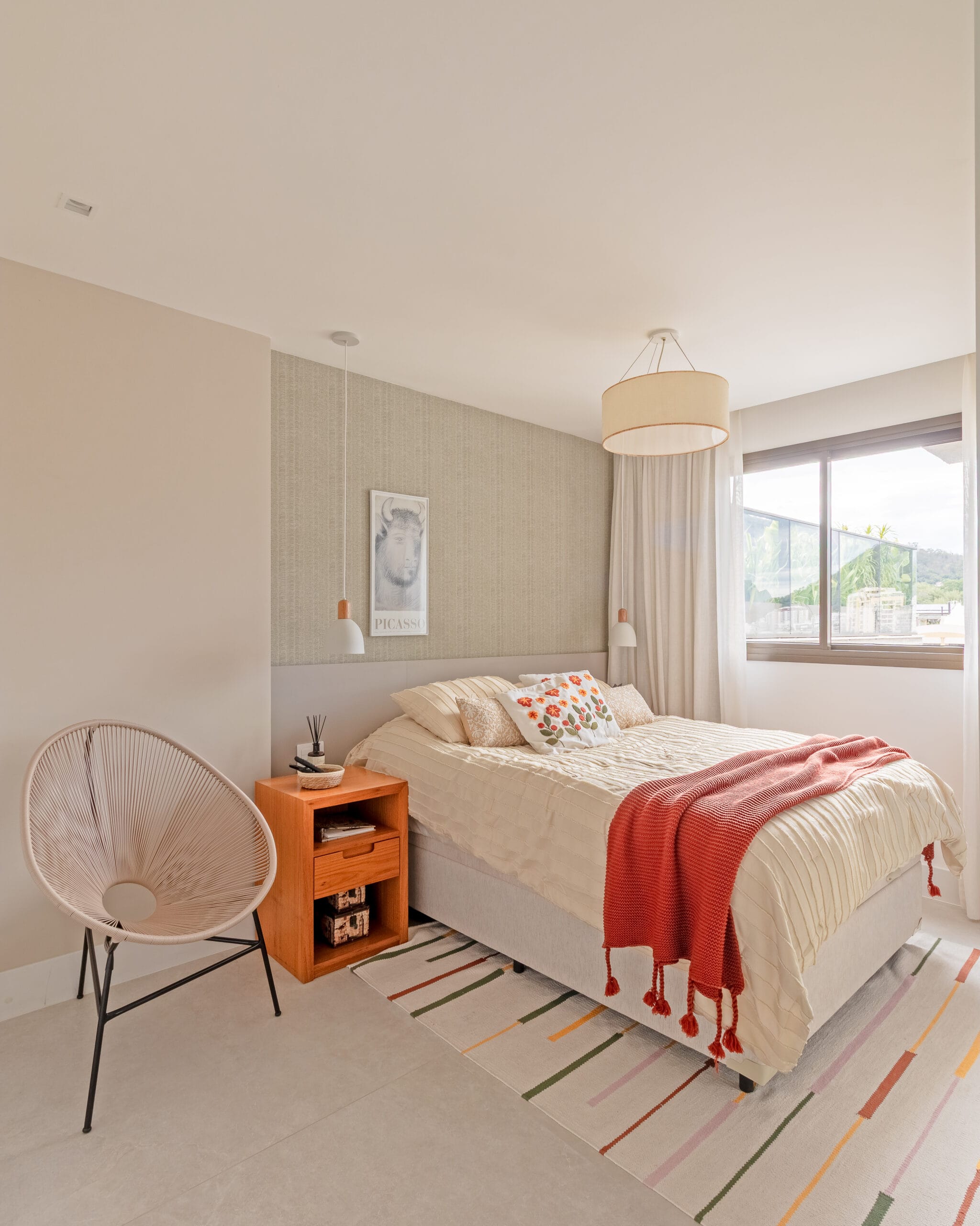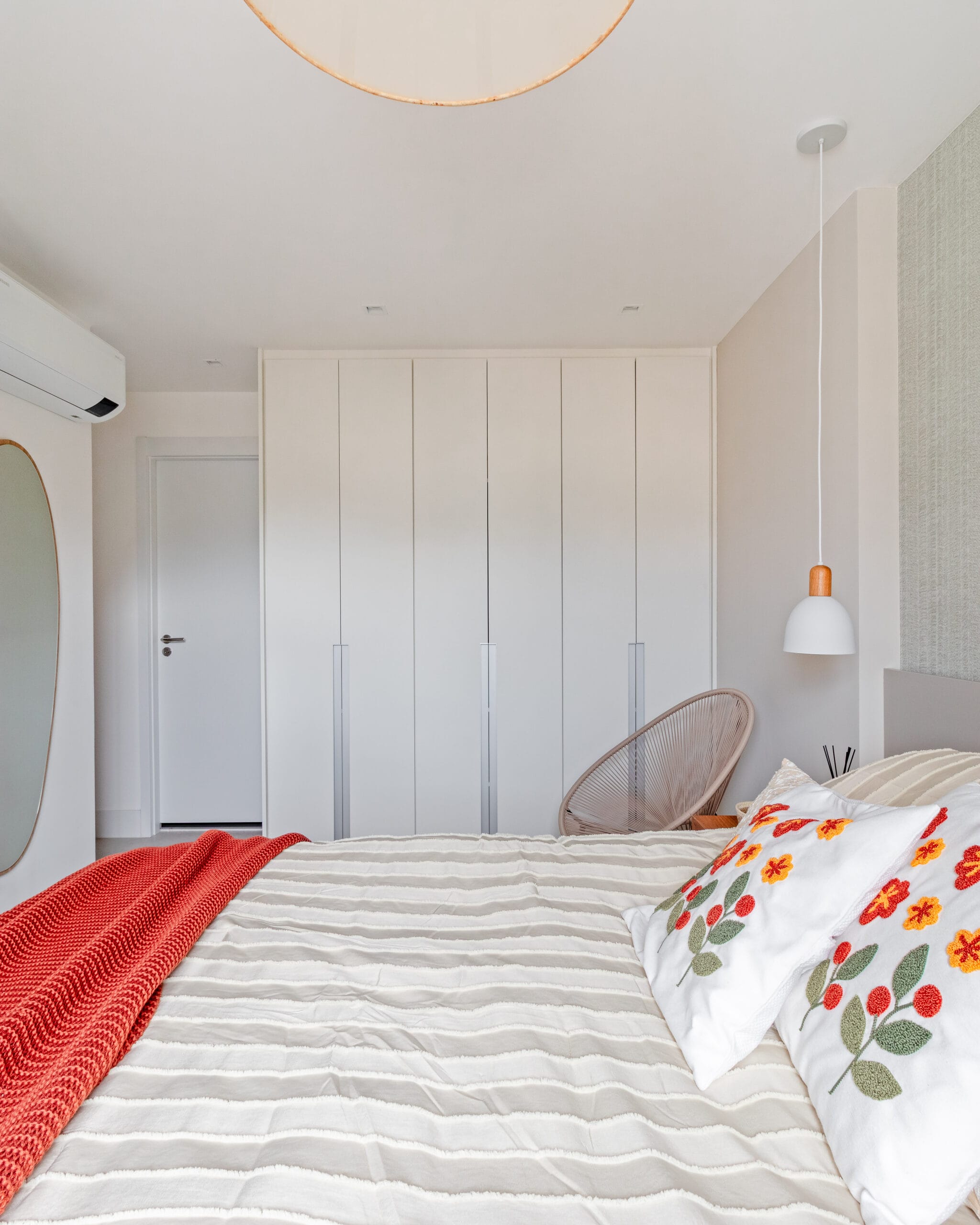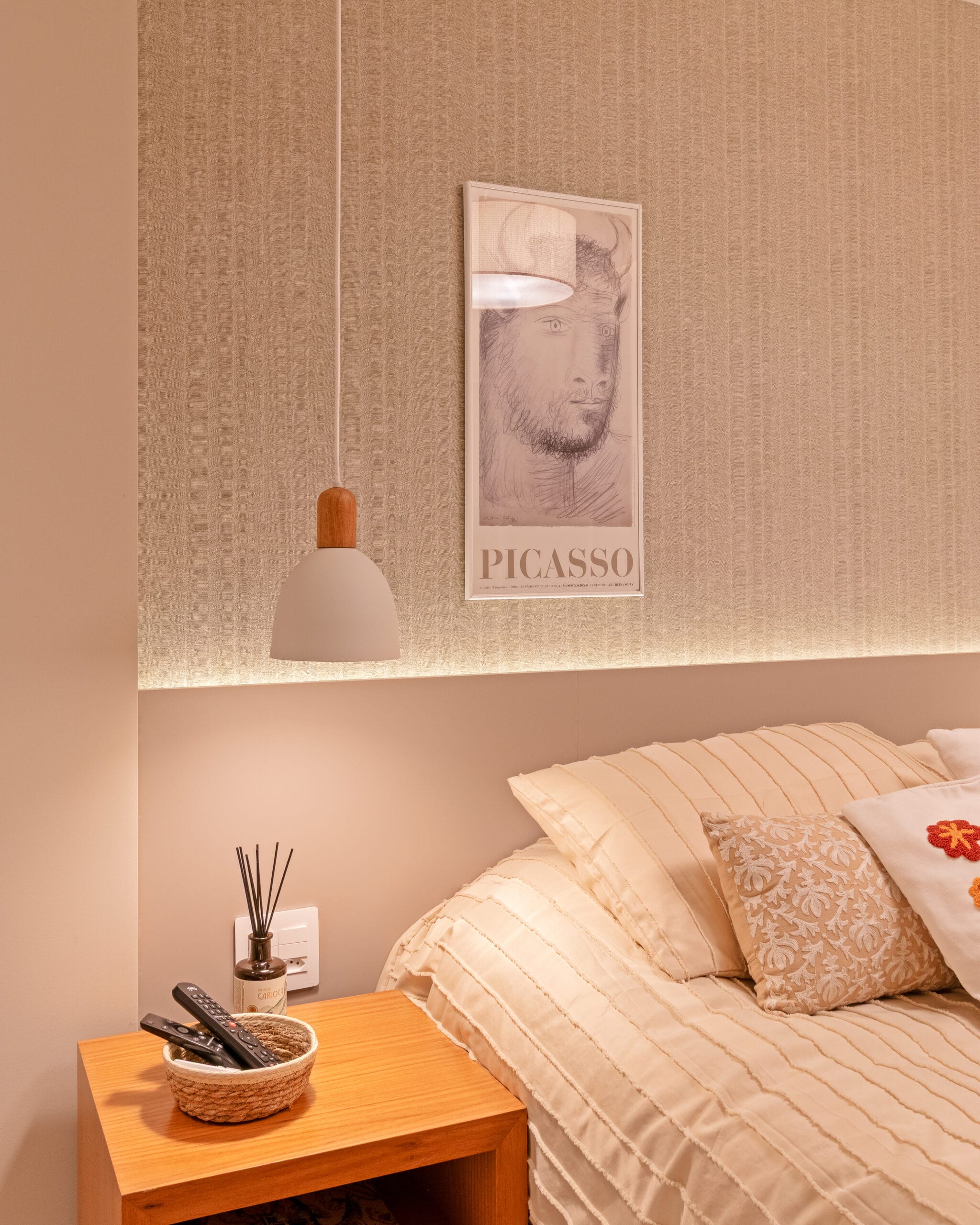 Na área íntima, criamos um verdadeiro refúgio para o casal a partir da unificação de duas suítes e da antiga varanda íntima. O novo layout contempla um amplo closet, banheiros independentes para ele e para ela, um escritório individual para cada um e uma área de estar com vista privilegiada para o Cristo. O resultado é uma suíte com atmosfera e conforto de hotel, pensada para o descanso e o bem-estar.