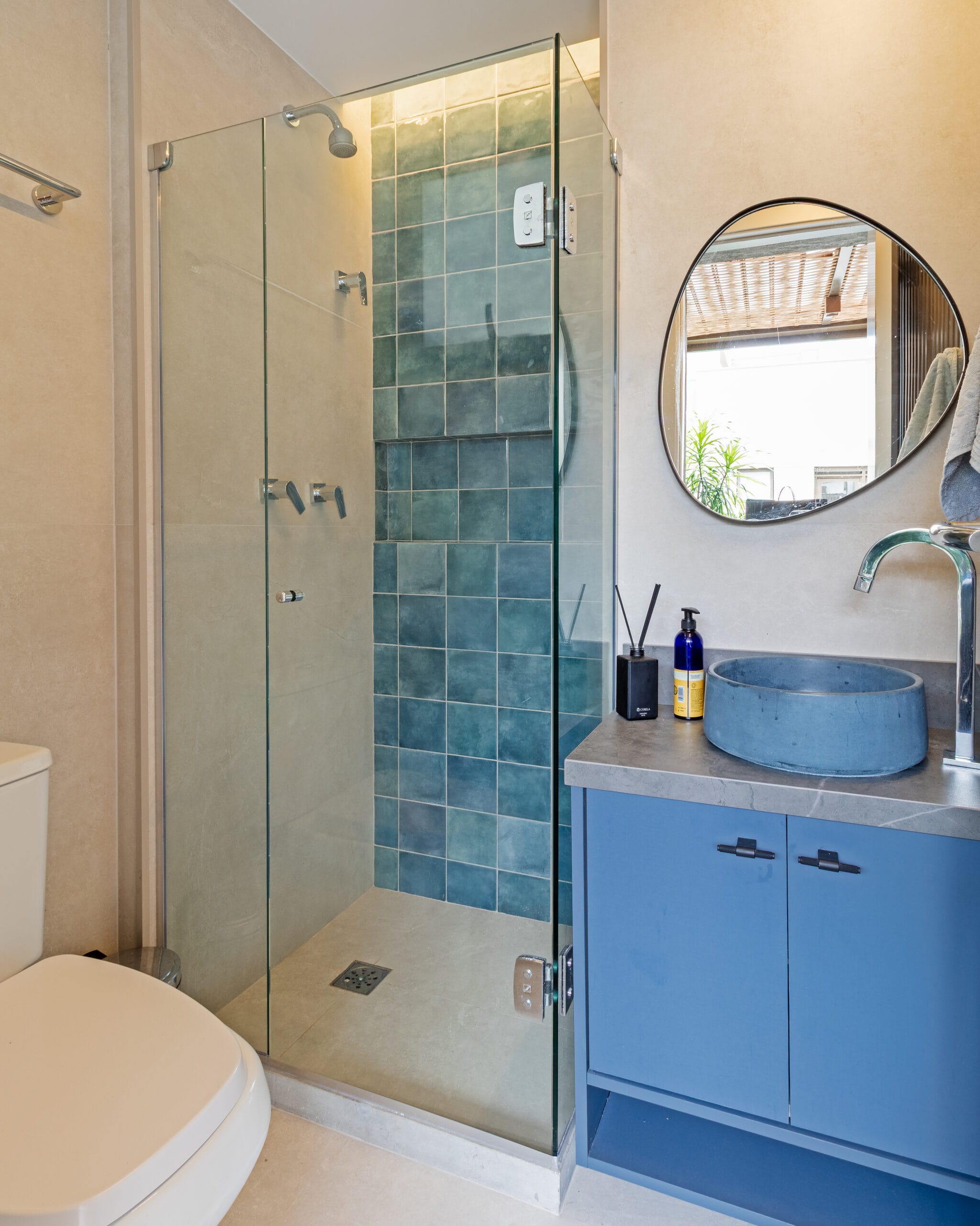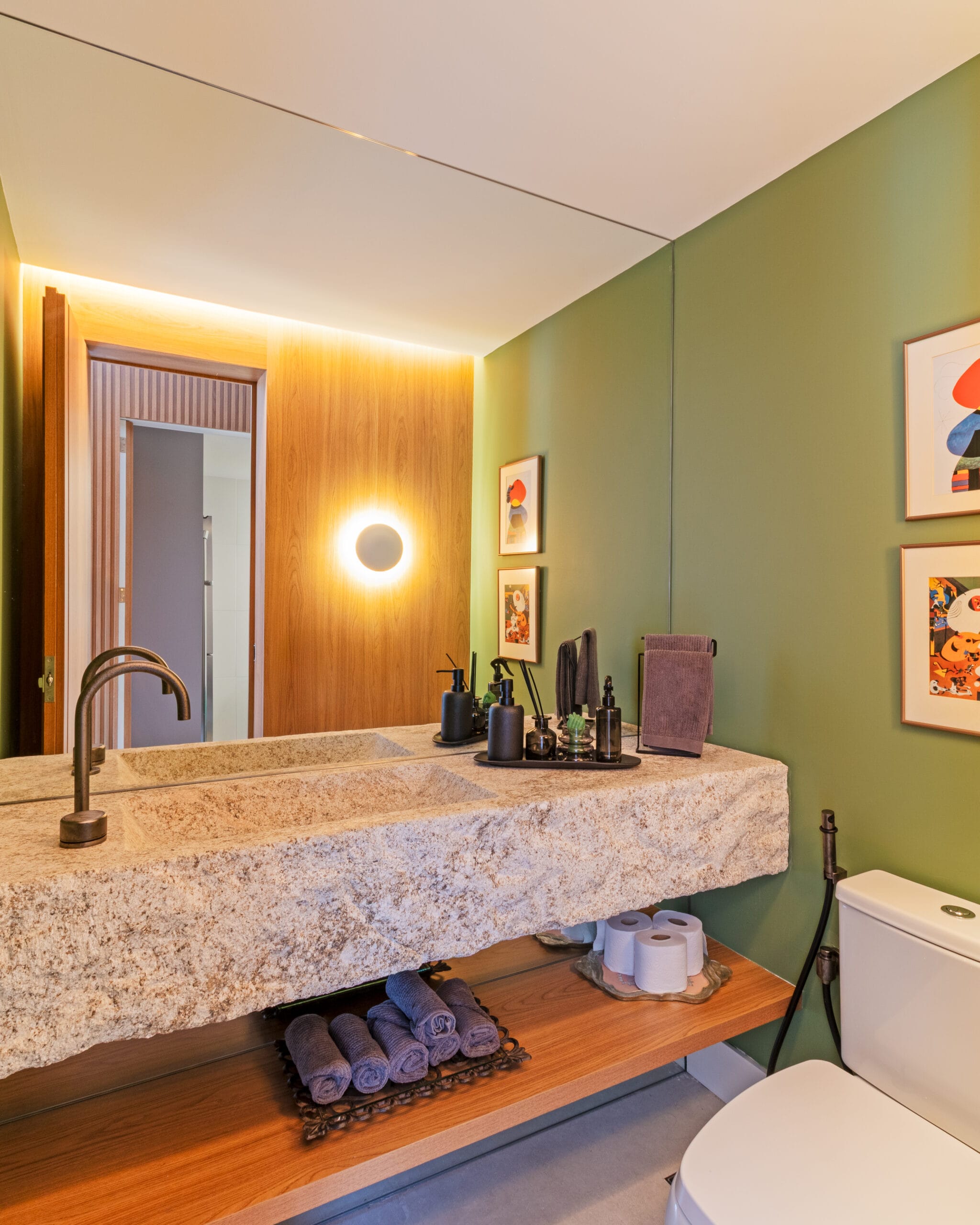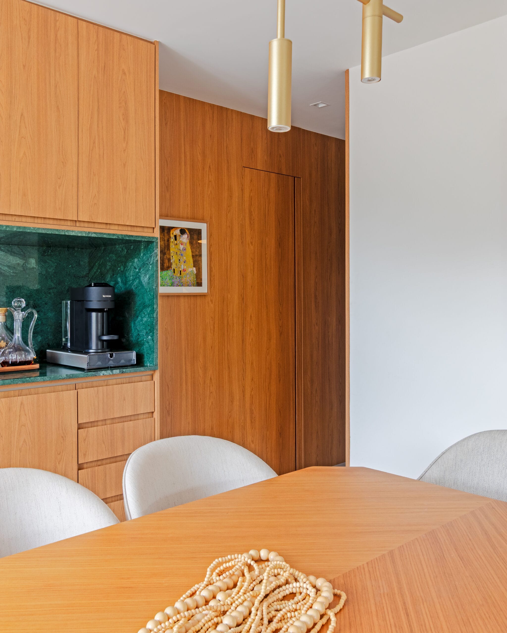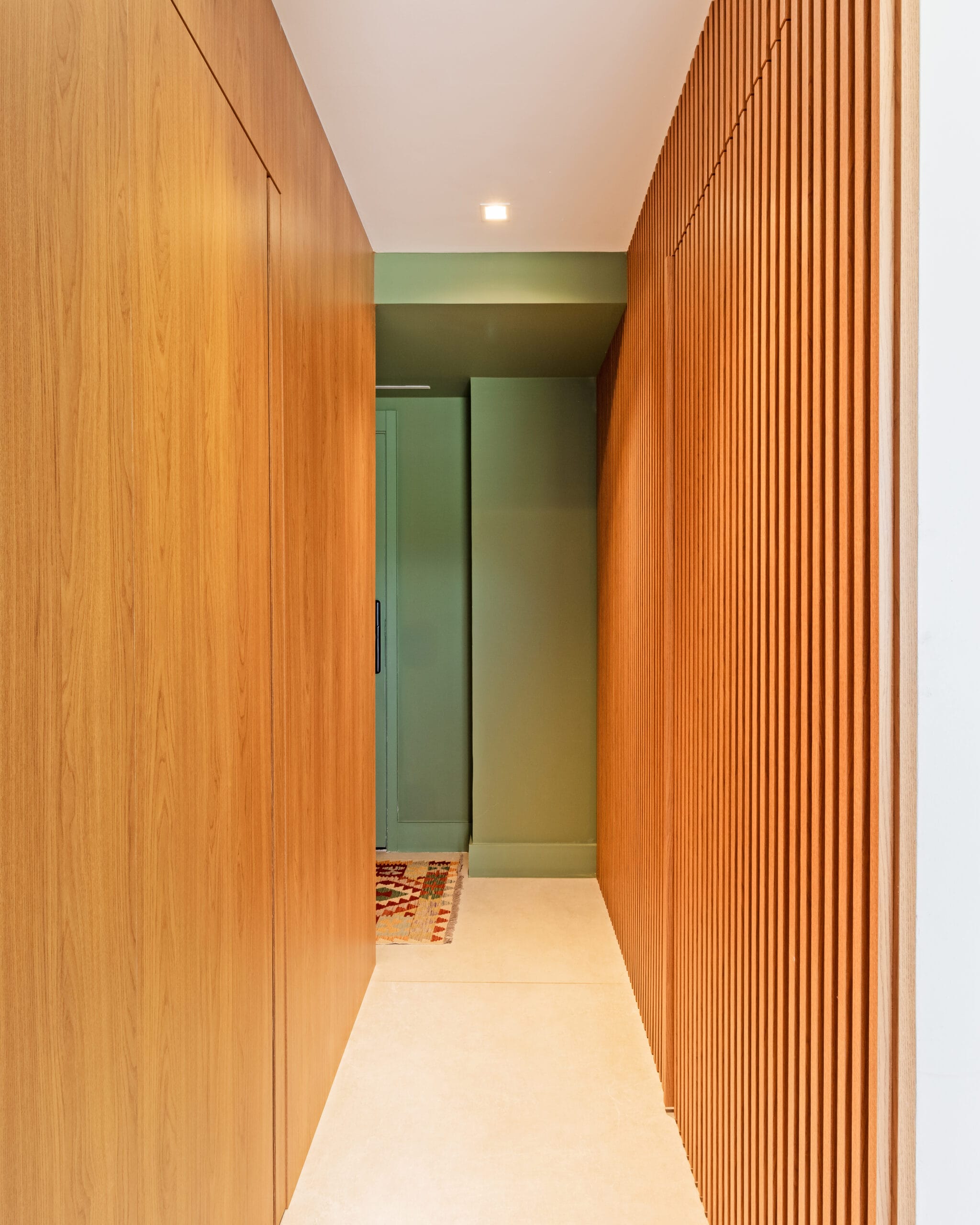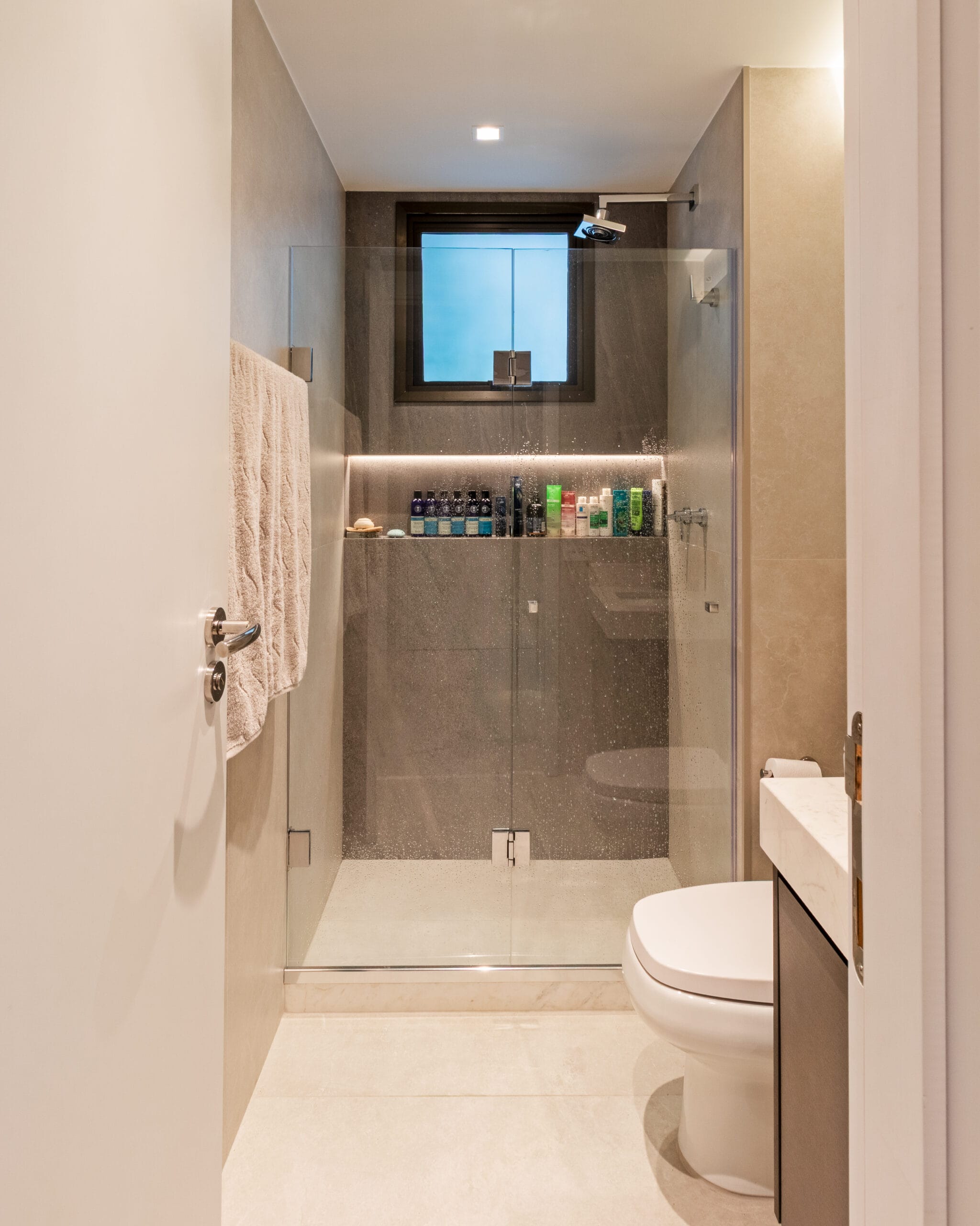 Na área íntima, criamos um verdadeiro refúgio para o casal a partir da unificação de duas suítes e da antiga varanda íntima. O novo layout contempla um amplo closet, banheiros independentes para ele e para ela, um escritório individual para cada um e uma área de estar com vista privilegiada para o Cristo. O resultado é uma suíte com atmosfera e conforto de hotel, pensada para o descanso e o bem-estar.