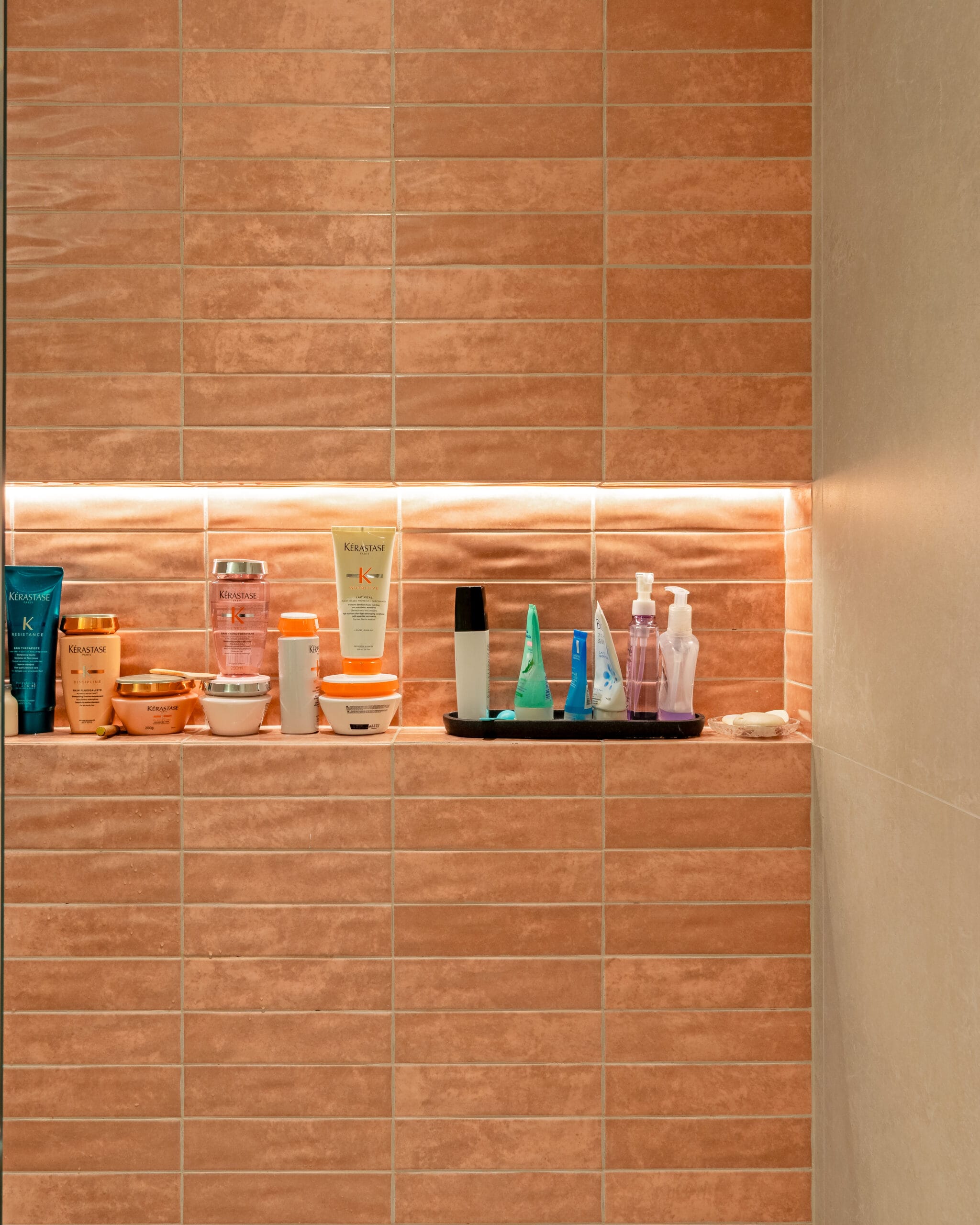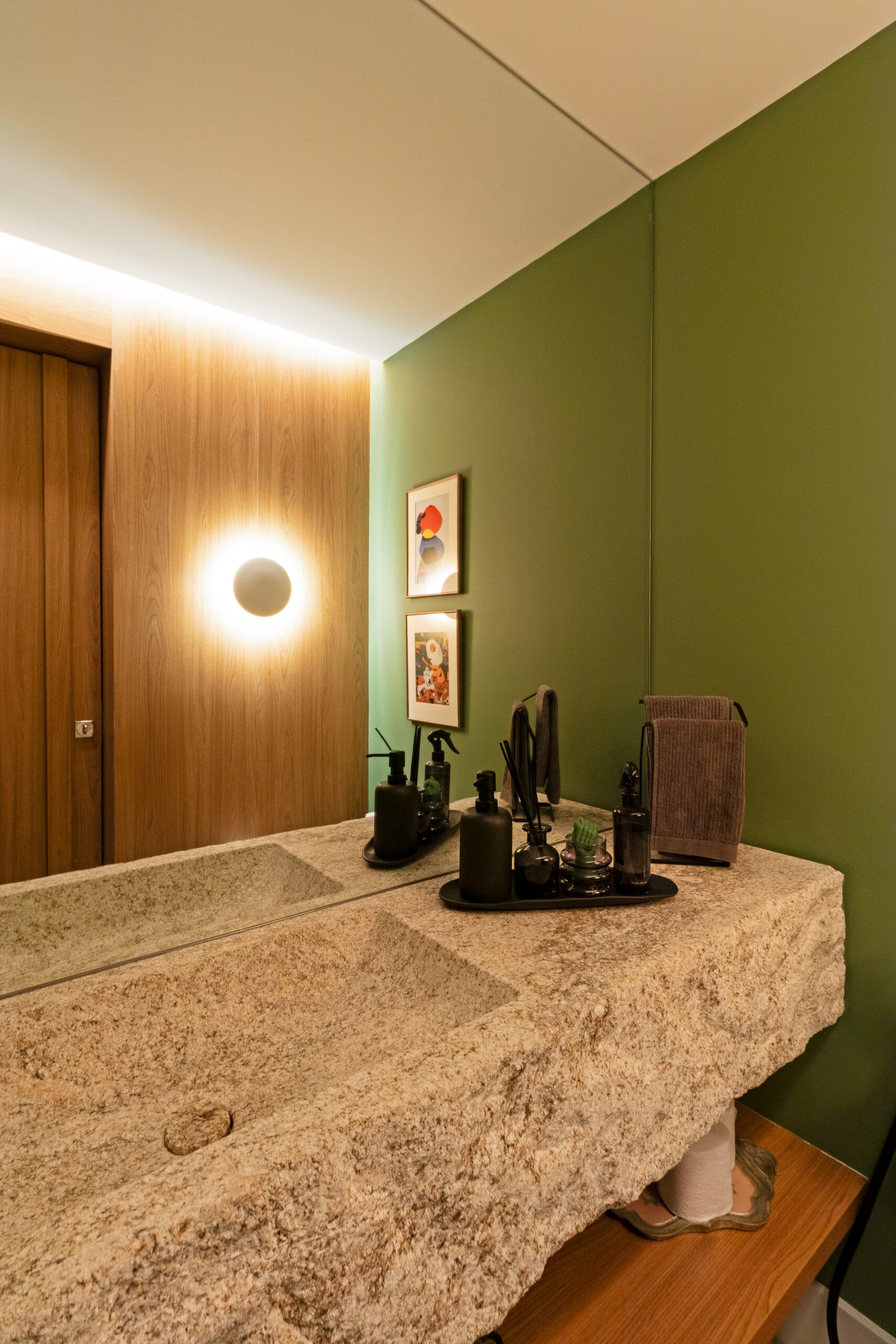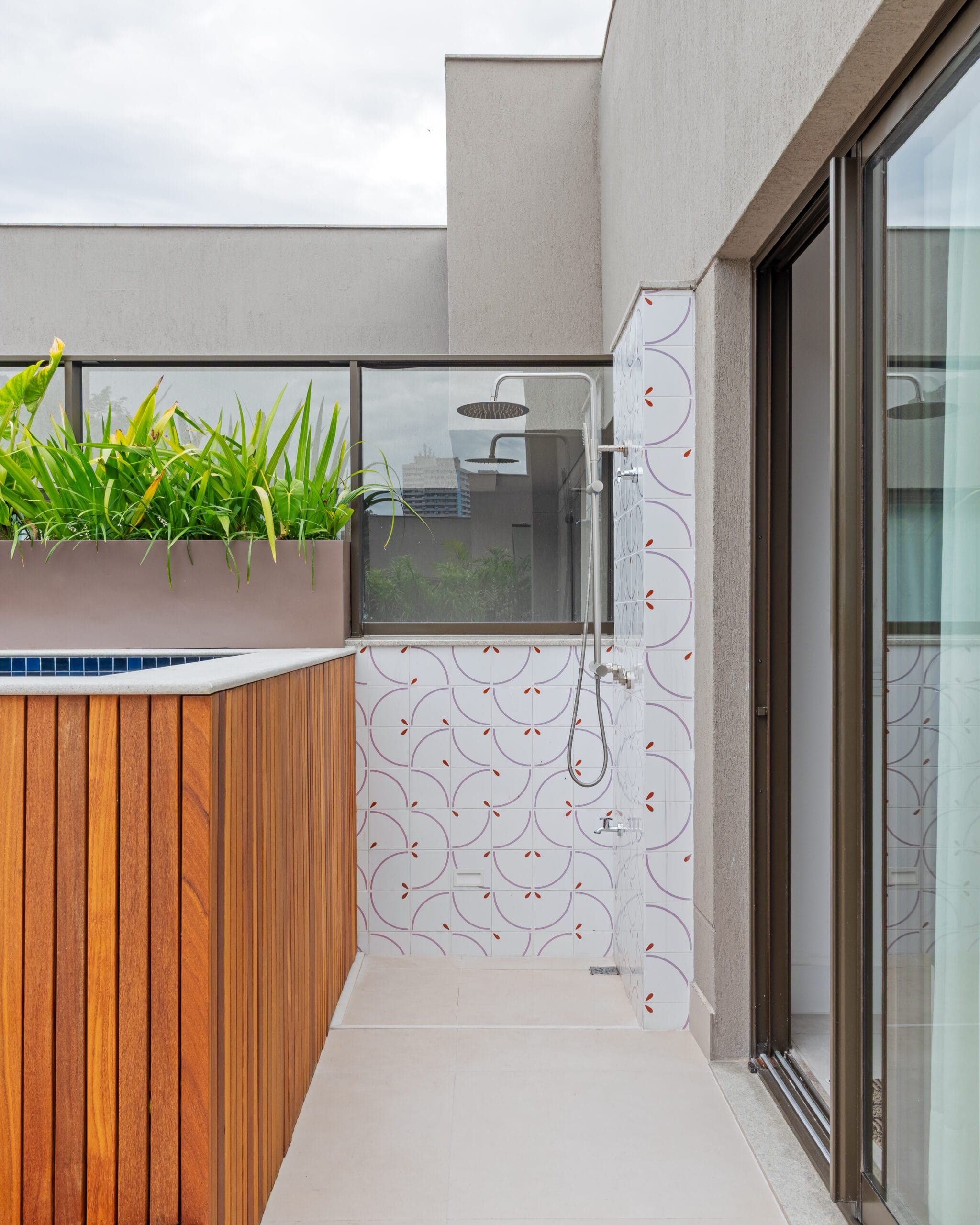 Fechando com chave de ouro os ambientes sociais e, pessoalmente, meu espaço favorito do projeto, a área da piscina. Seu desenho foi cuidadosamente pensado para dialogar com as curvas do relevo ao redor. O paisagismo reforça a privacidade e cria uma continuidade entre o verde do apartamento, os morros ao redor e a área gourmet. As curvas suaves e delgadas formam um banco integrado, ideal para longas conversas e momentos de contemplação.