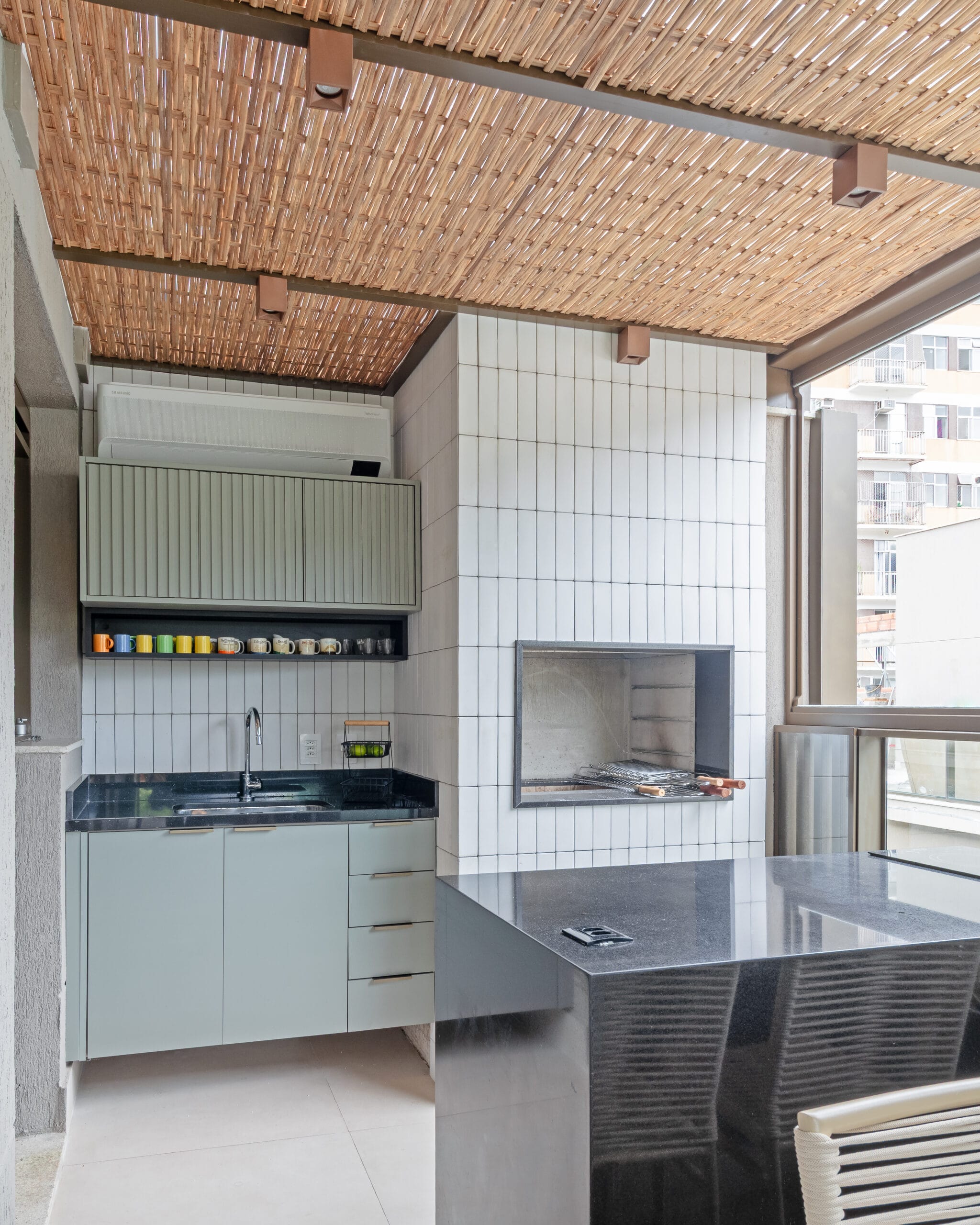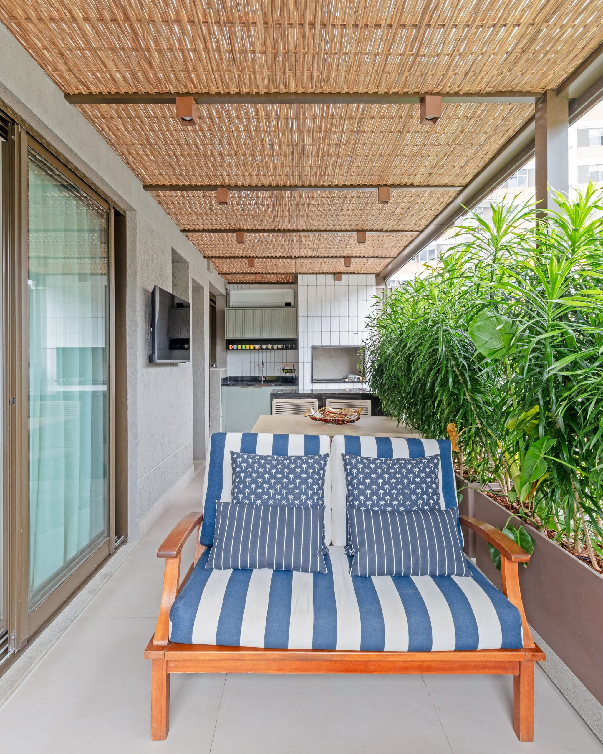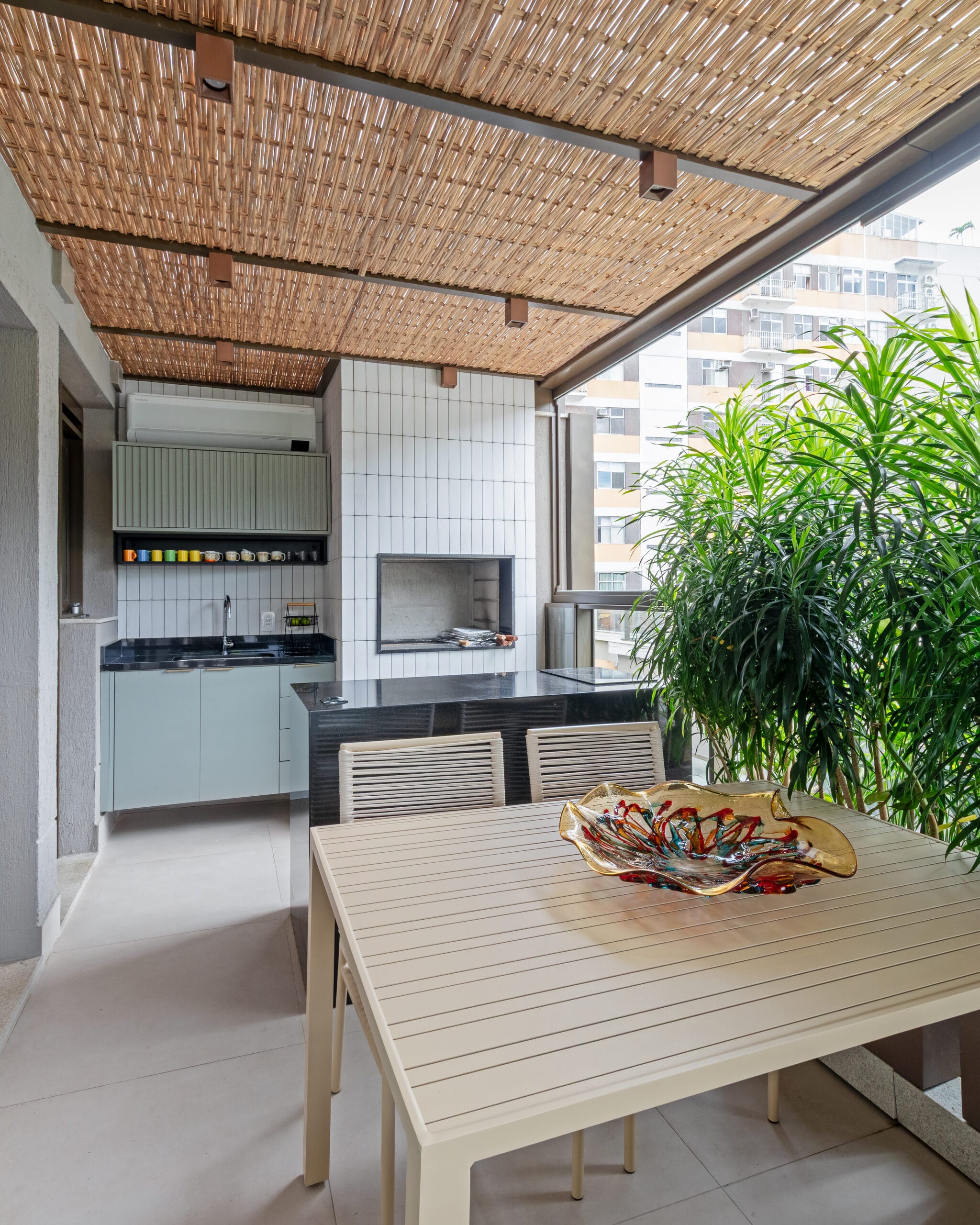 Conectada à sala, a área gourmet foi fechada com pergolado e cortinas retráteis, permitindo a climatização do ambiente quando necessário. O aconchego fica por conta do forro em palha de dendê natural, feita à mão na Bahia, aliado ao paisagismo, que além de valorizar o espaço, garante privacidade em relação aos vizinhos.