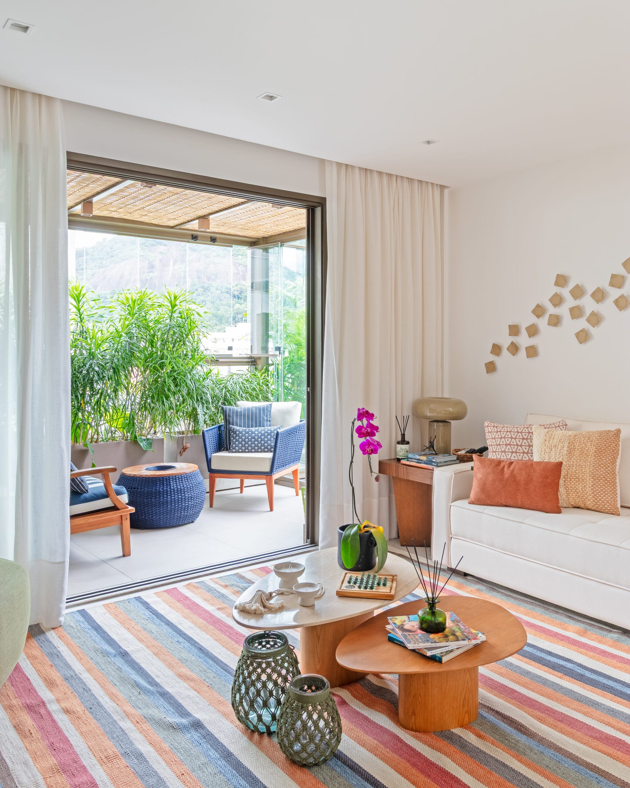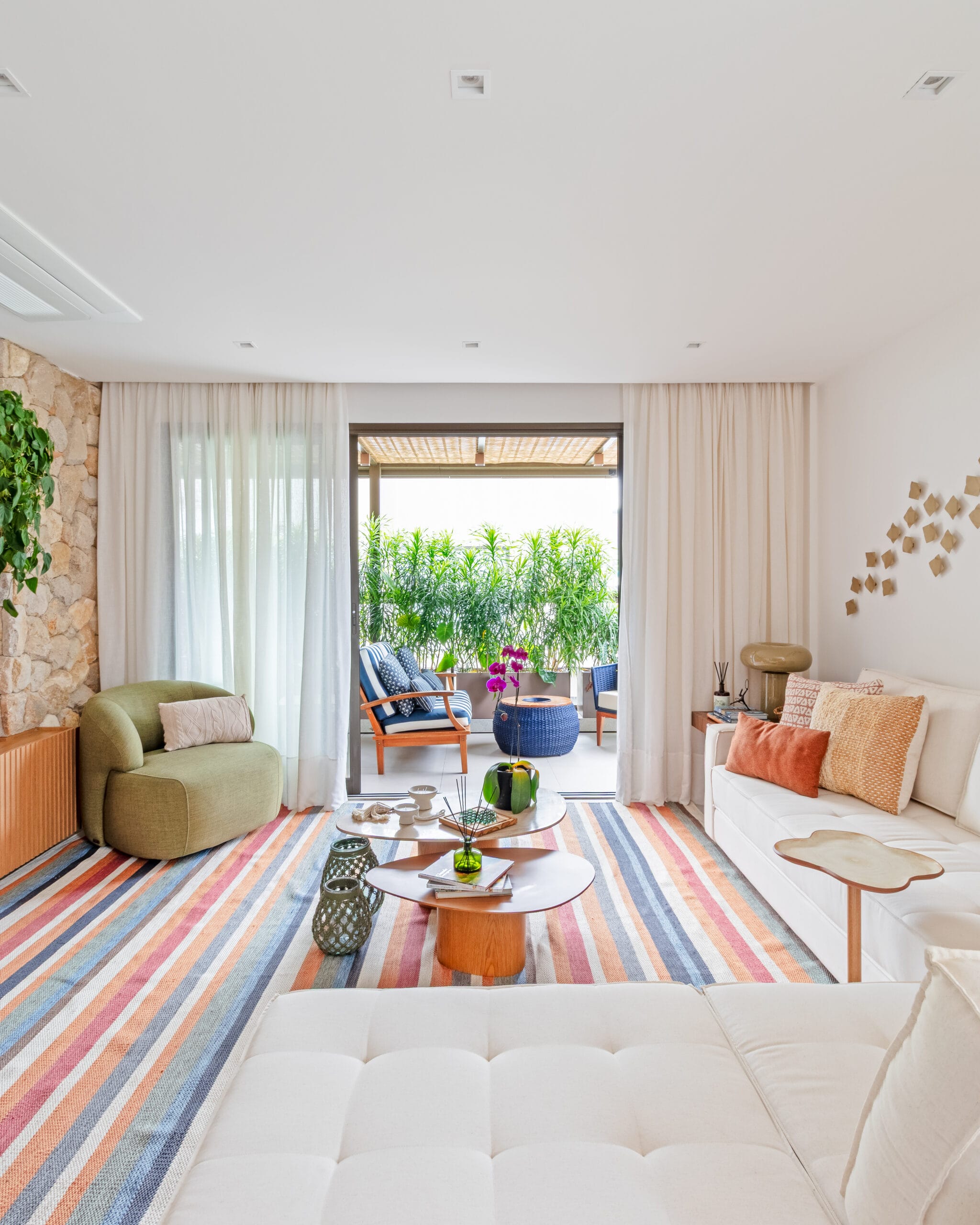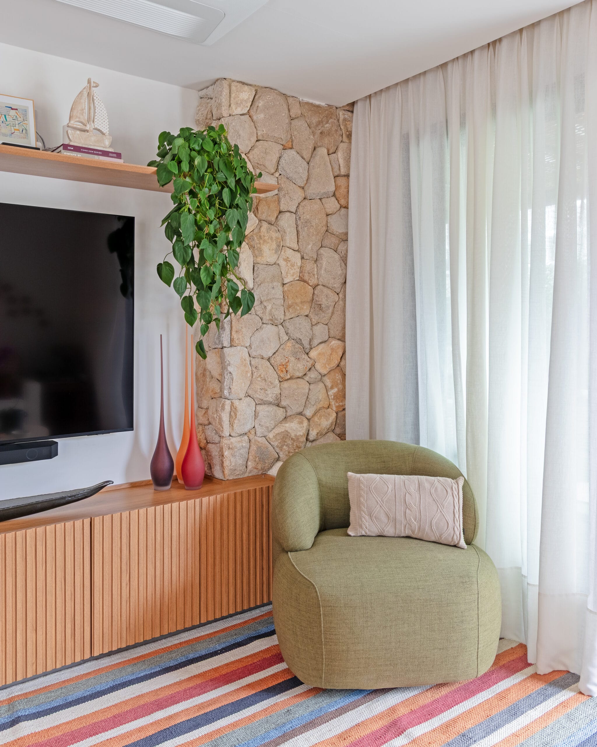 Conectada à sala, a área gourmet foi fechada com pergolado e cortinas retráteis, permitindo a climatização do ambiente quando necessário. O aconchego fica por conta do forro em palha de dendê natural, feita à mão na Bahia, aliado ao paisagismo, que além de valorizar o espaço, garante privacidade em relação aos vizinhos.