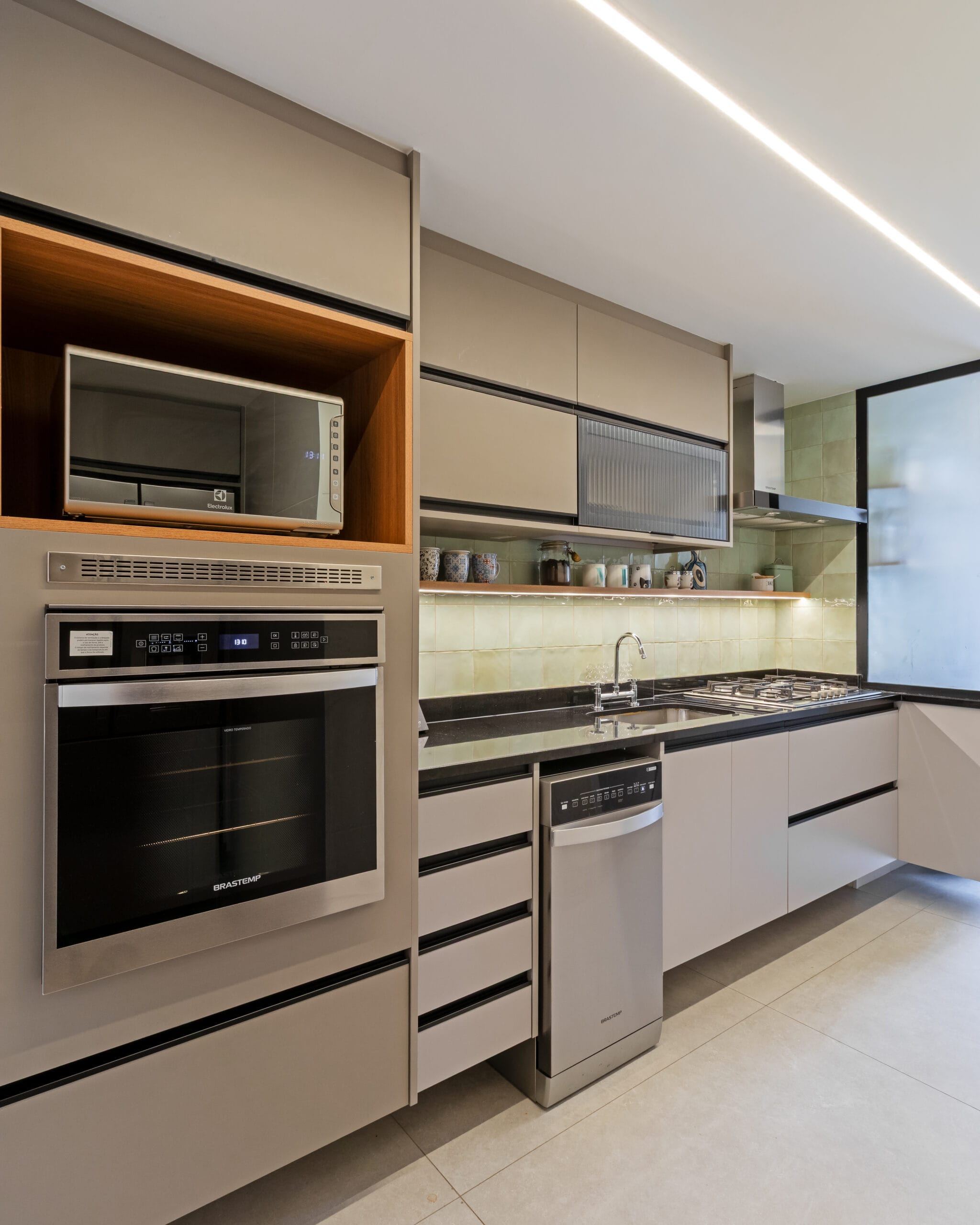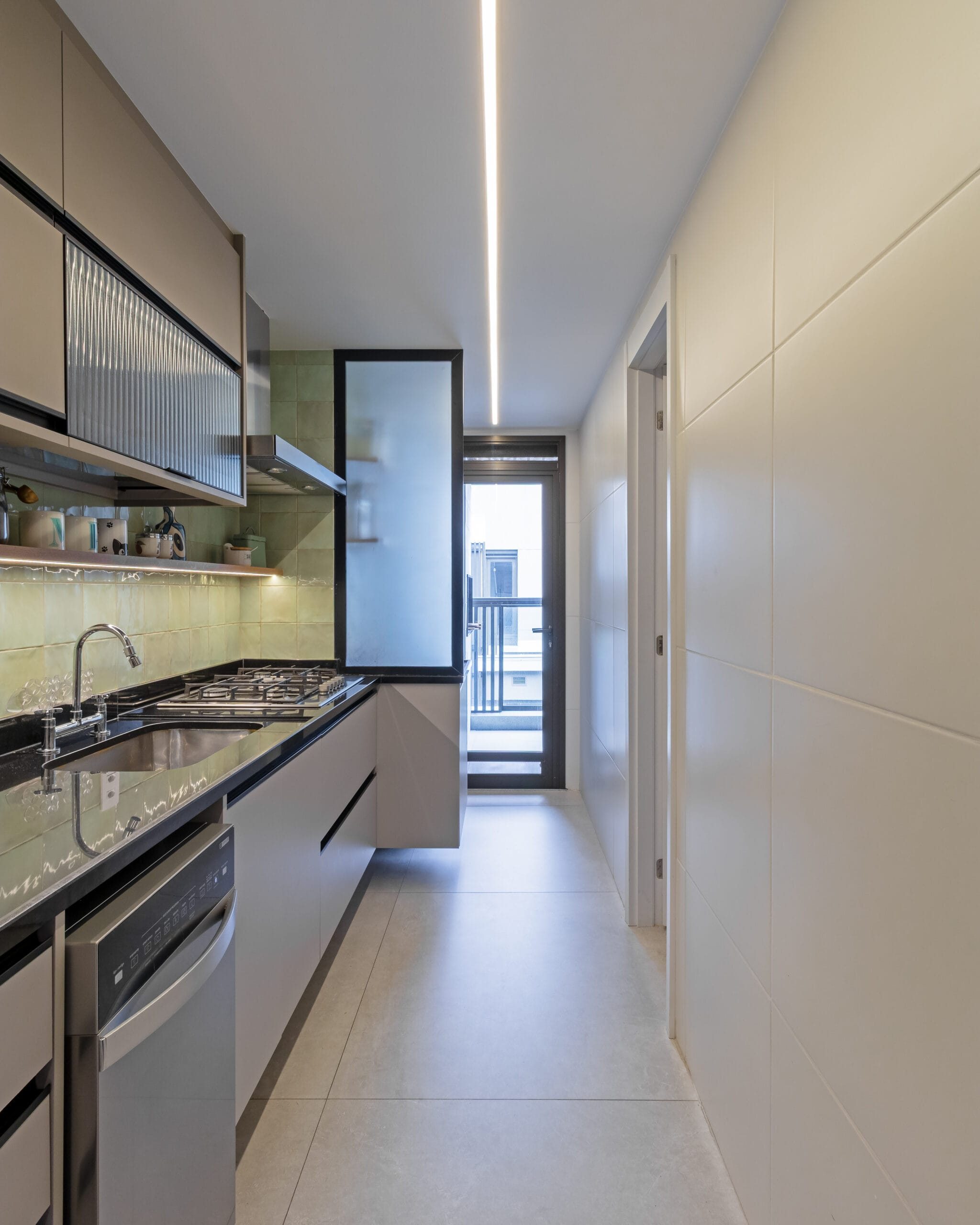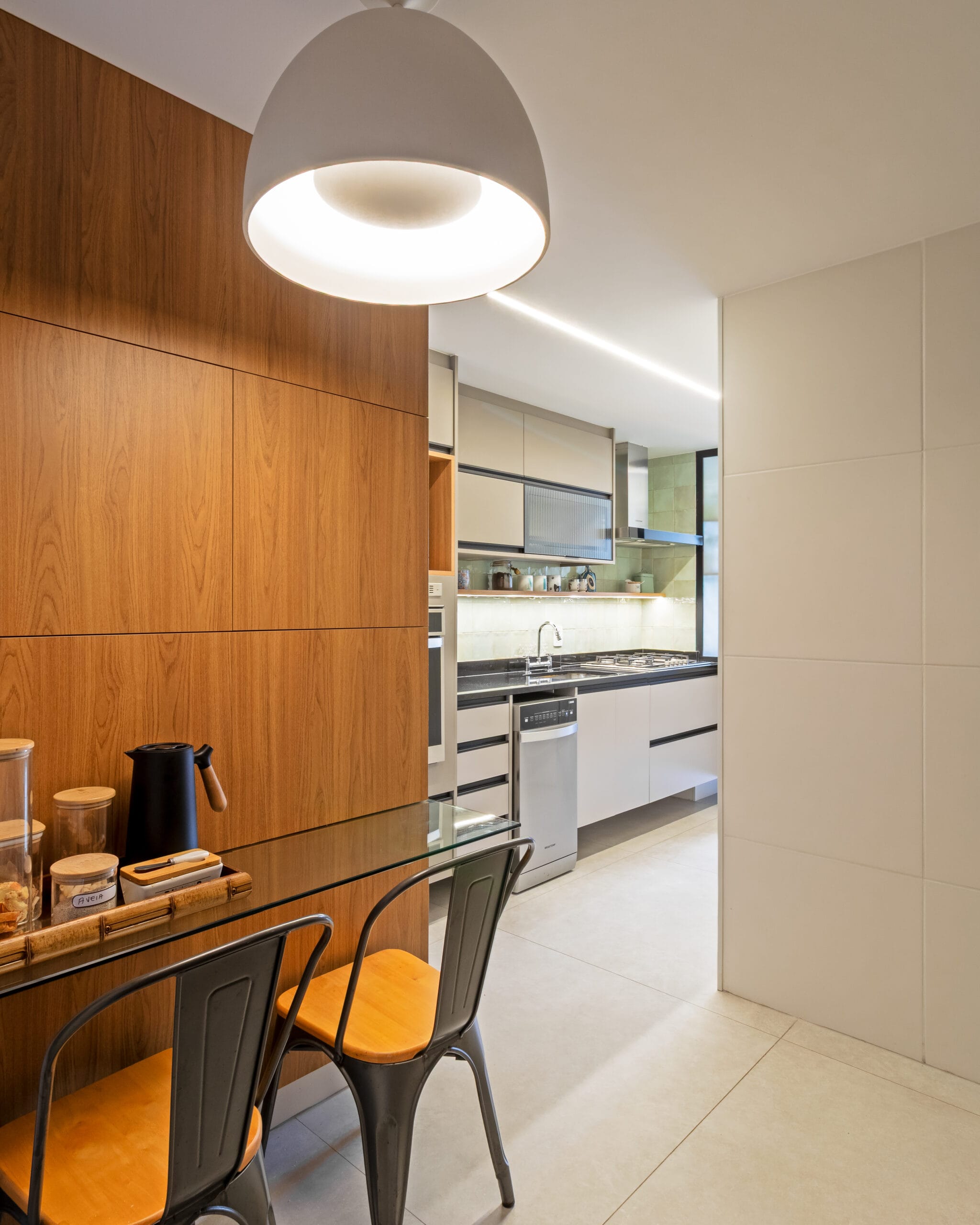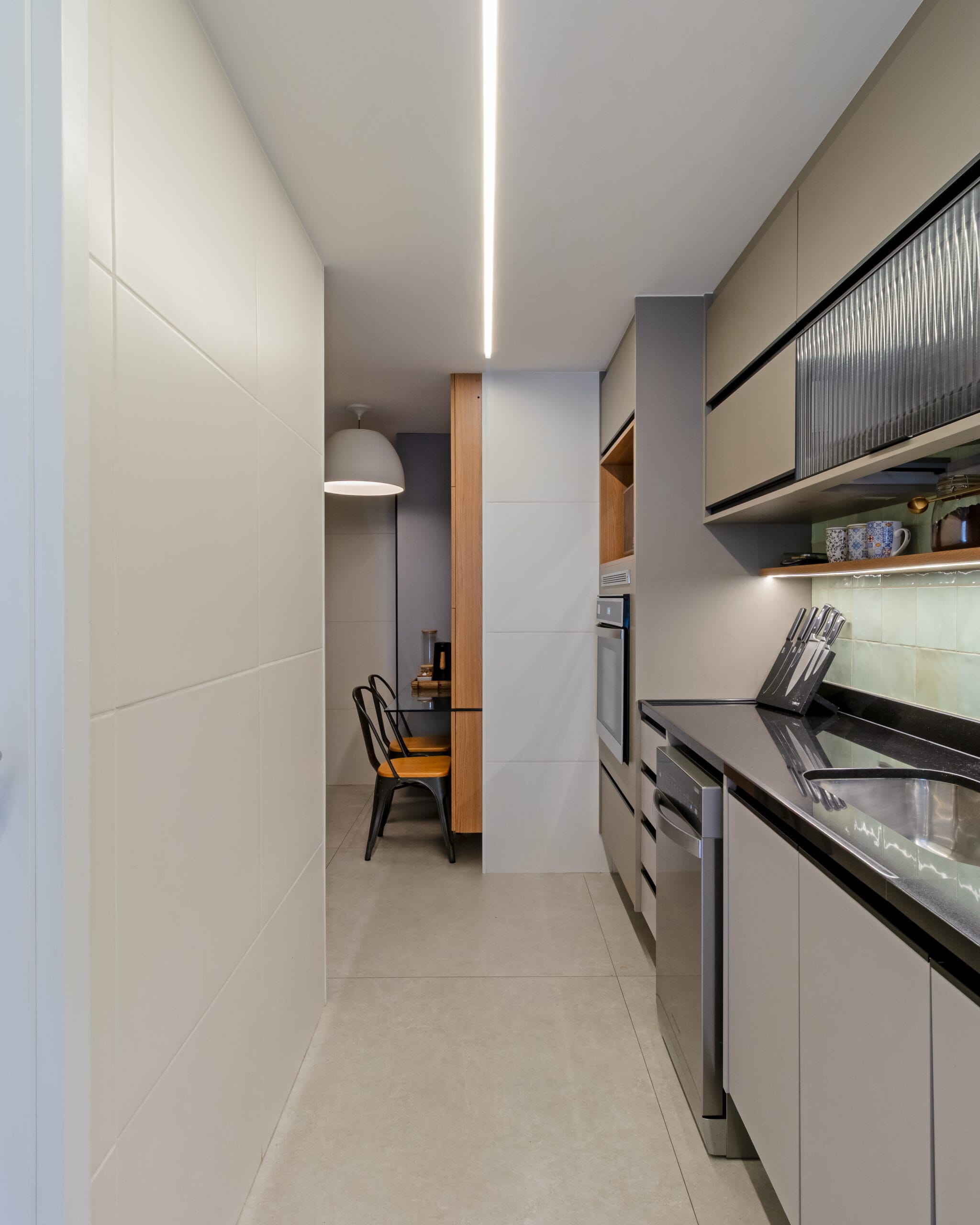 Cobertura linear adquirida ainda na planta por um casal com os filhos já crescidos, que valoriza a convivência com netos, familiares e amigos. A partir desse estilo de vida, o projeto deu destaque a todos os ambientes sociais da casa, sem deixar de atender, com conforto e funcionalidade, às necessidades do dia a dia do casal.