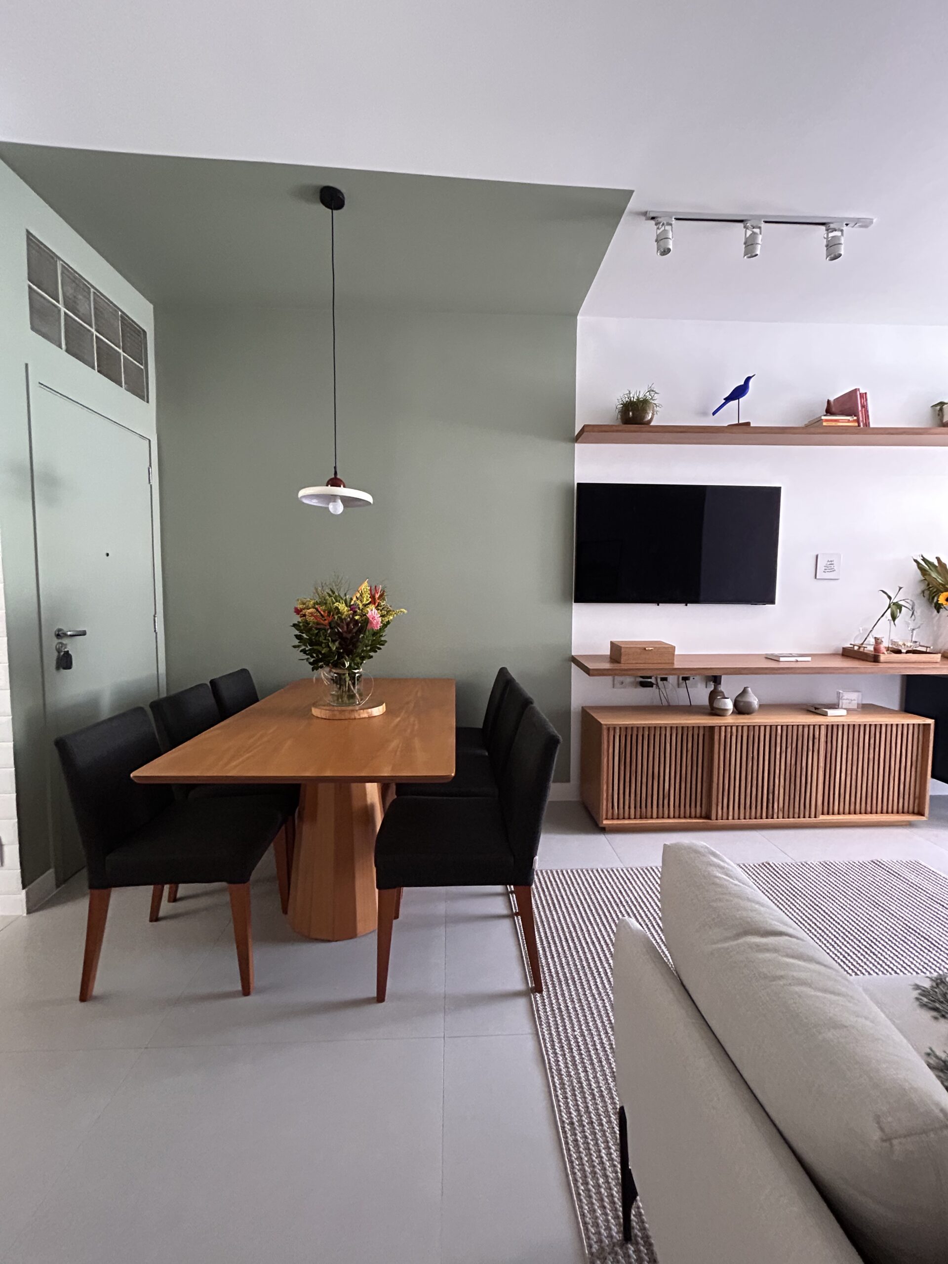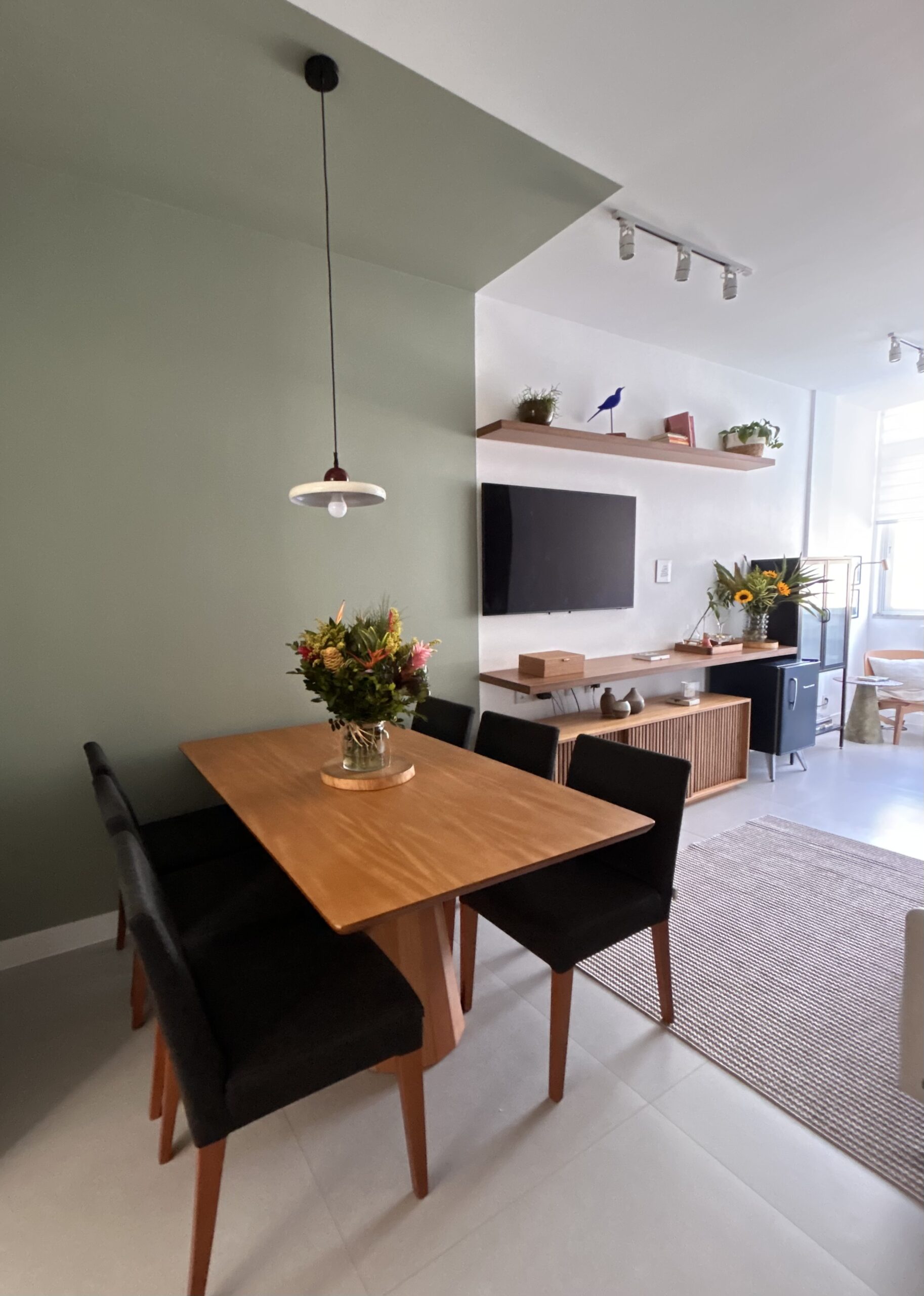 A área de jantar foi posicionada como protagonista do espaço e demarcada através da pintura na parede, criando identidade sem a necessidade de grandes intervenções. Na área de estar, um sofá de três lugares se integra ao rack de 1,80 m em freijó natural, compondo um espaço confortável para o dia a dia. Próximo à janela, criamos ainda um pequeno cantinho de bar e leitura, ideal para momentos de pausa.