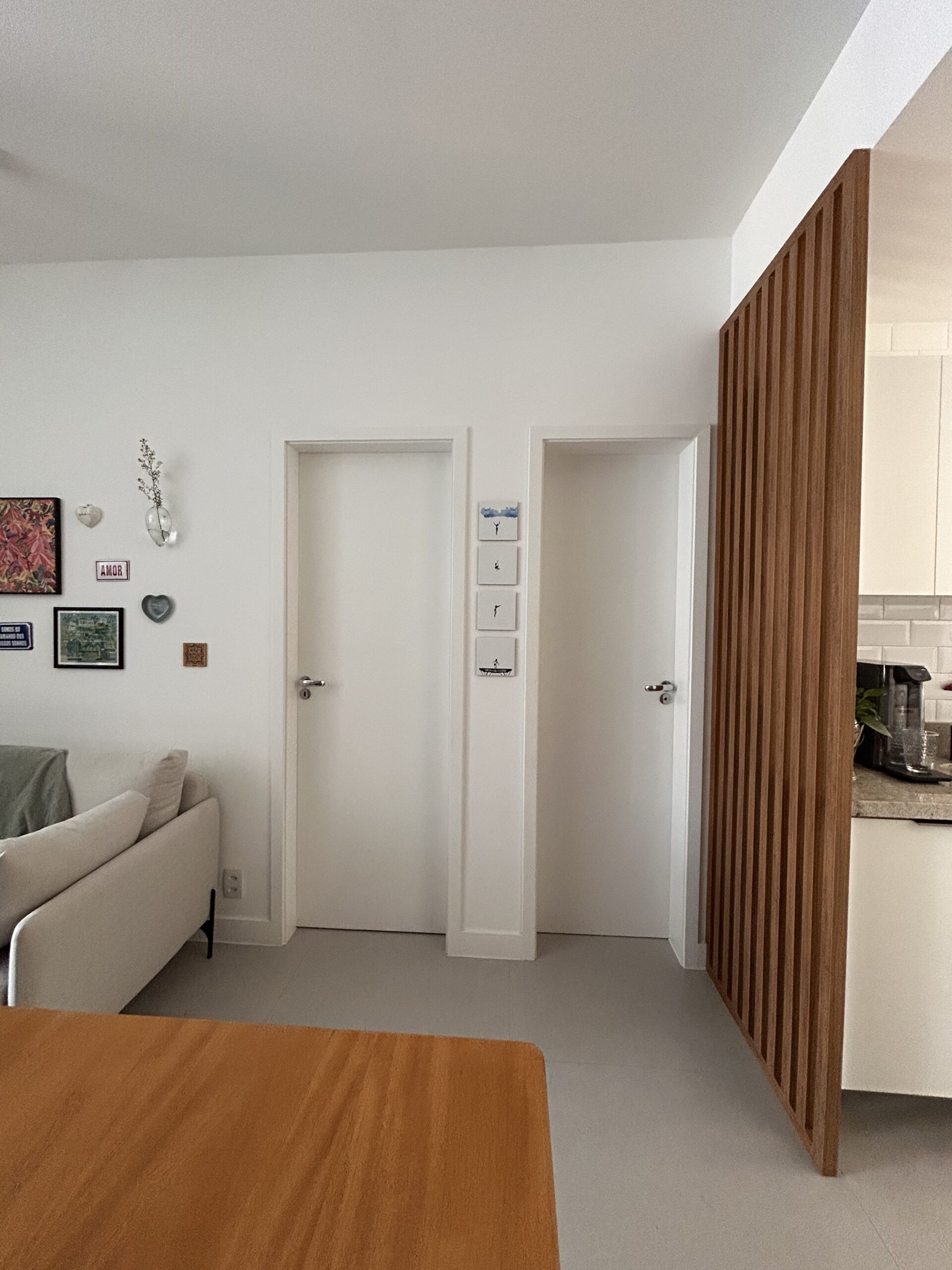 Para complementar a organização do ambiente, foi criada uma marcenaria pontual com prateleiras e um brise vazado que delimita sutilmente a integração entre cozinha e sala. Como se trata de uma solução leve e modular, esses elementos podem ser reaproveitados futuramente em outro imóvel.