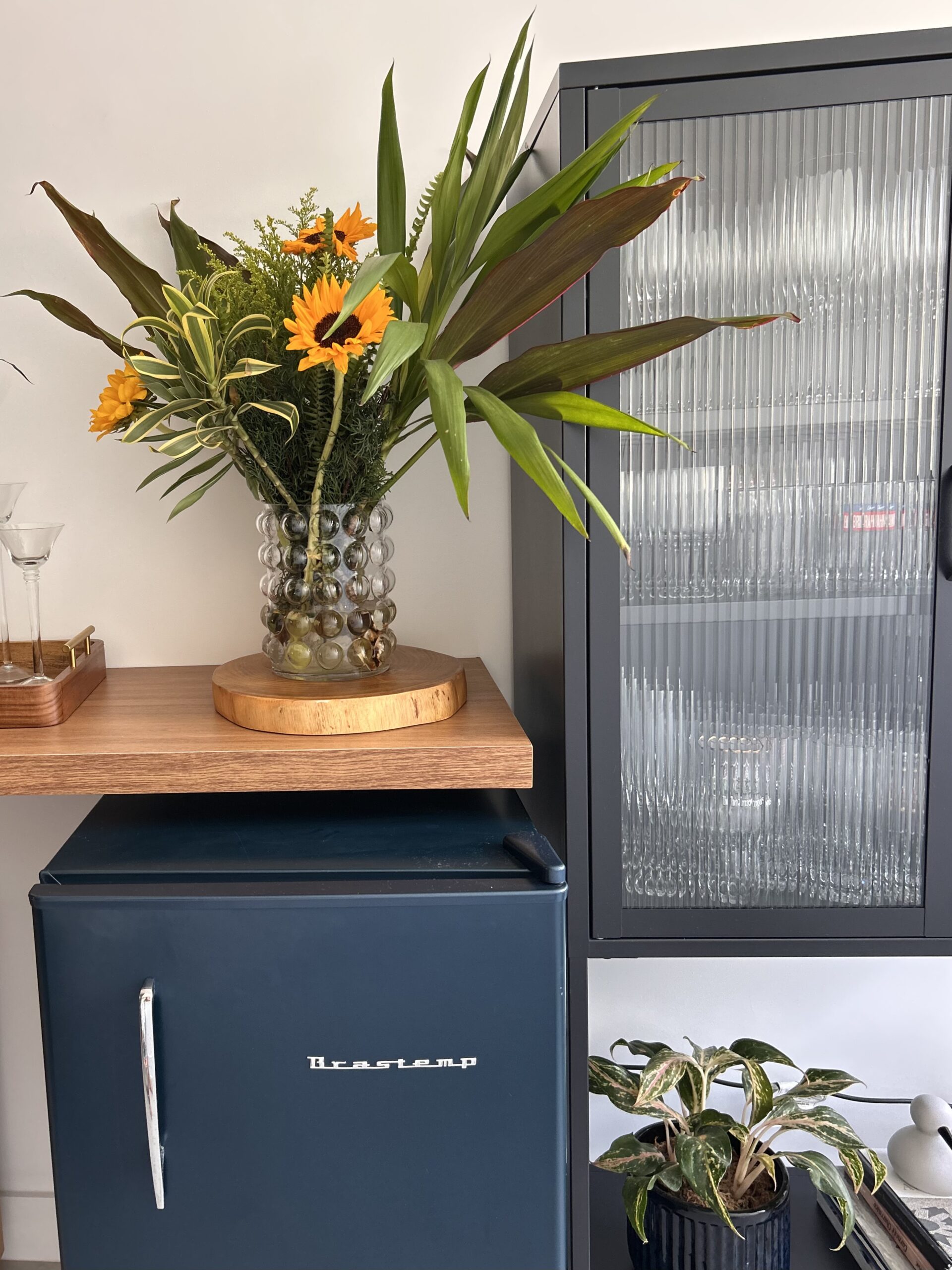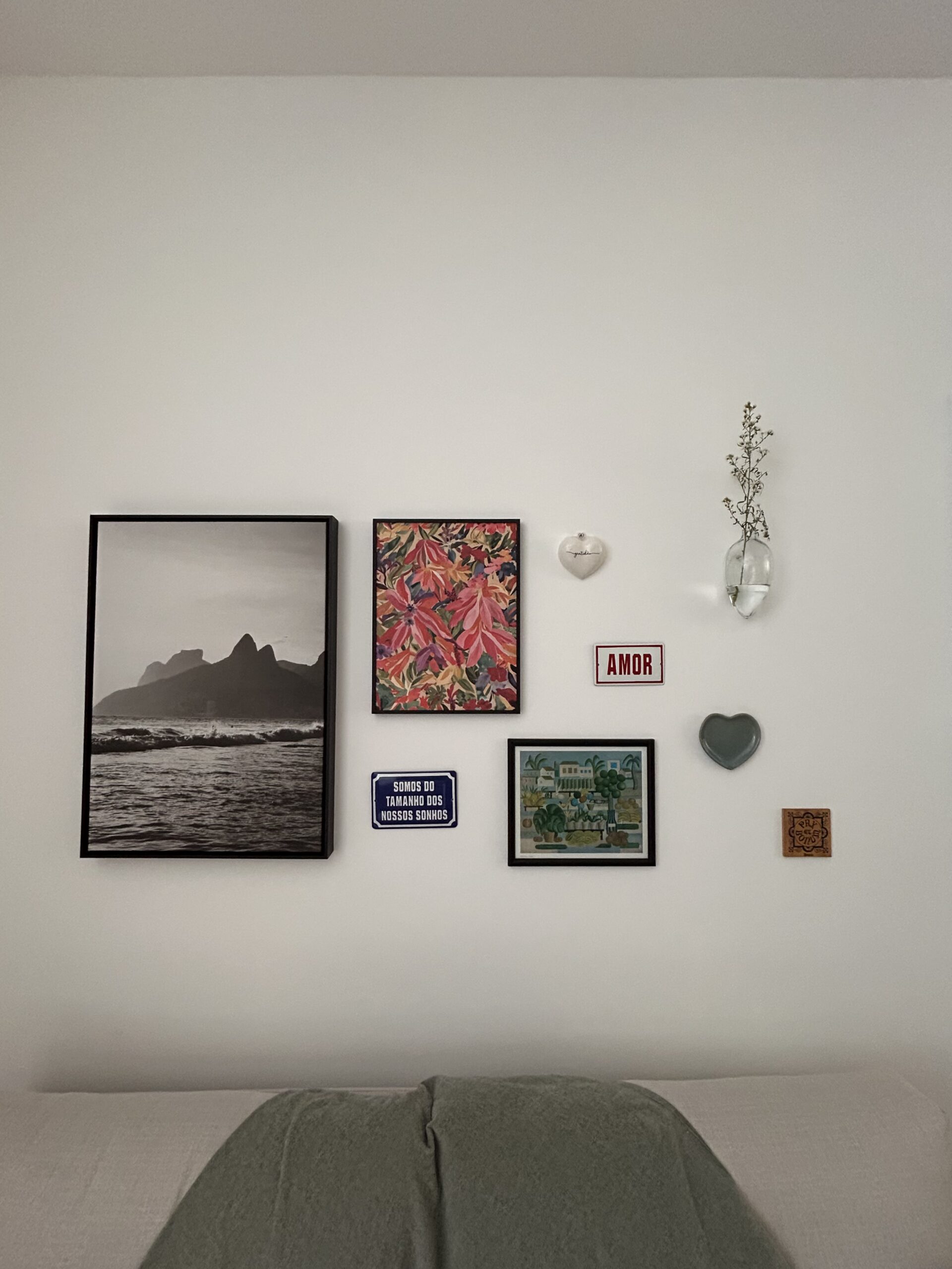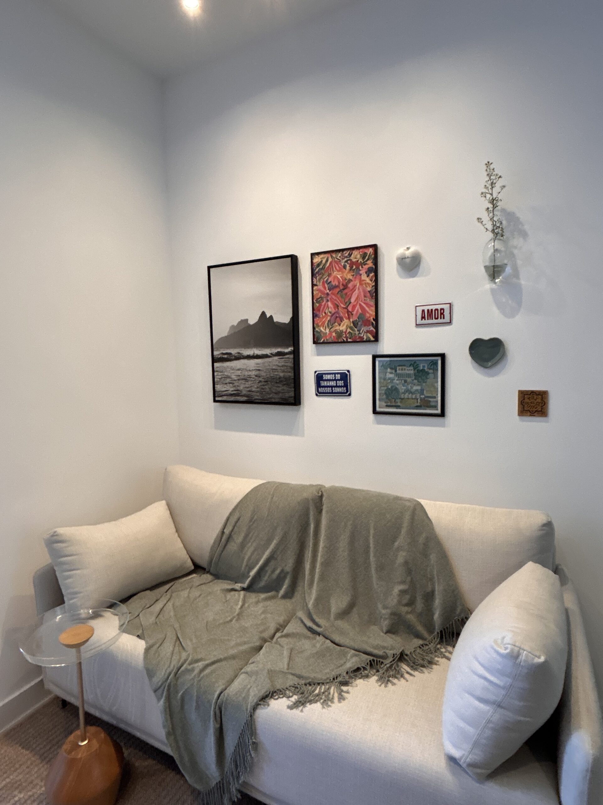 Um dos pontos mais especiais do projeto é a parede atrás do sofá. Ali, reunimos objetos que a cliente já possuía com novos elementos cuidadosamente escolhidos, criando uma composição cheia de significado e personalidade, um verdadeiro reflexo da história e do estilo dos moradores.