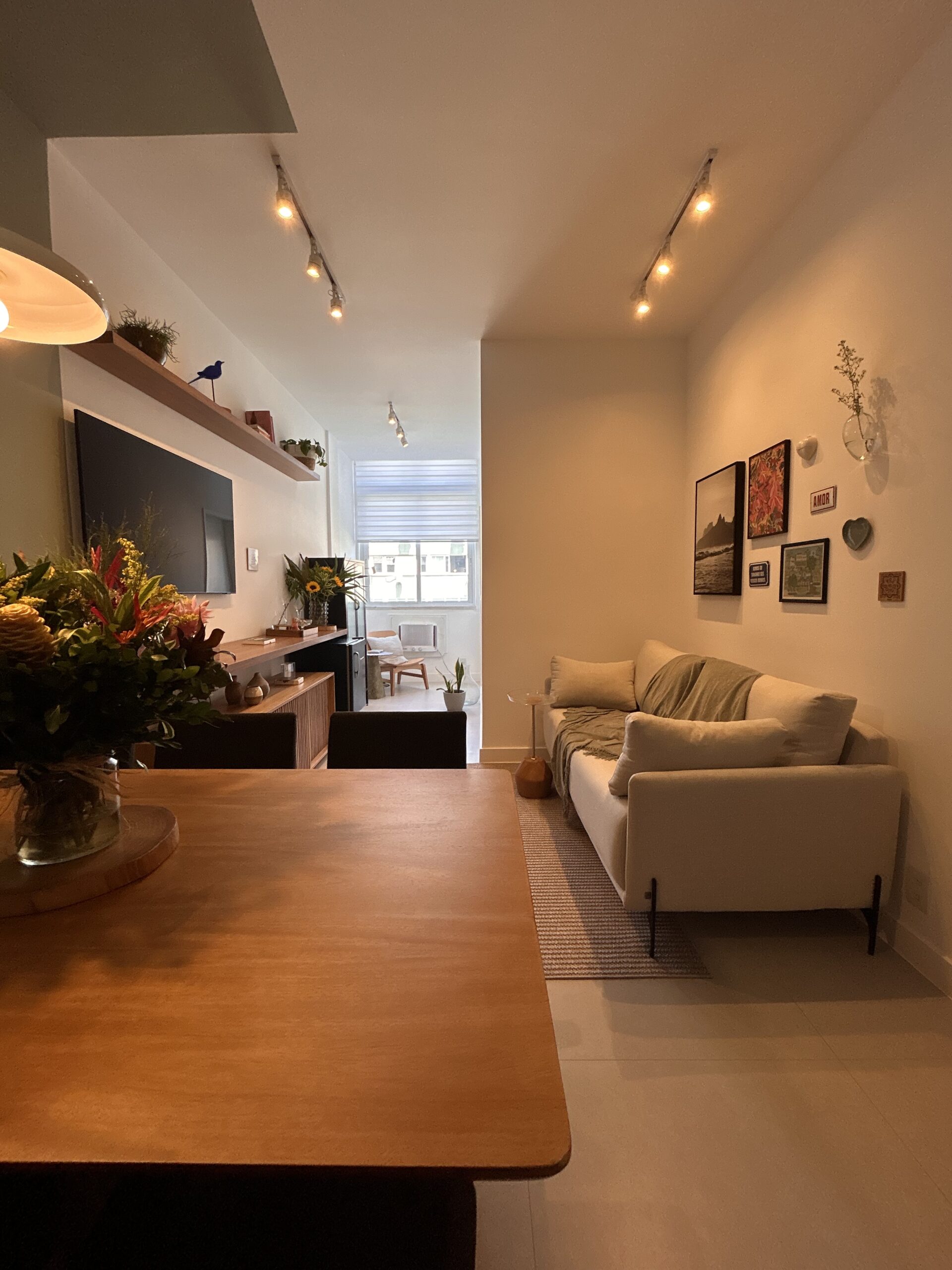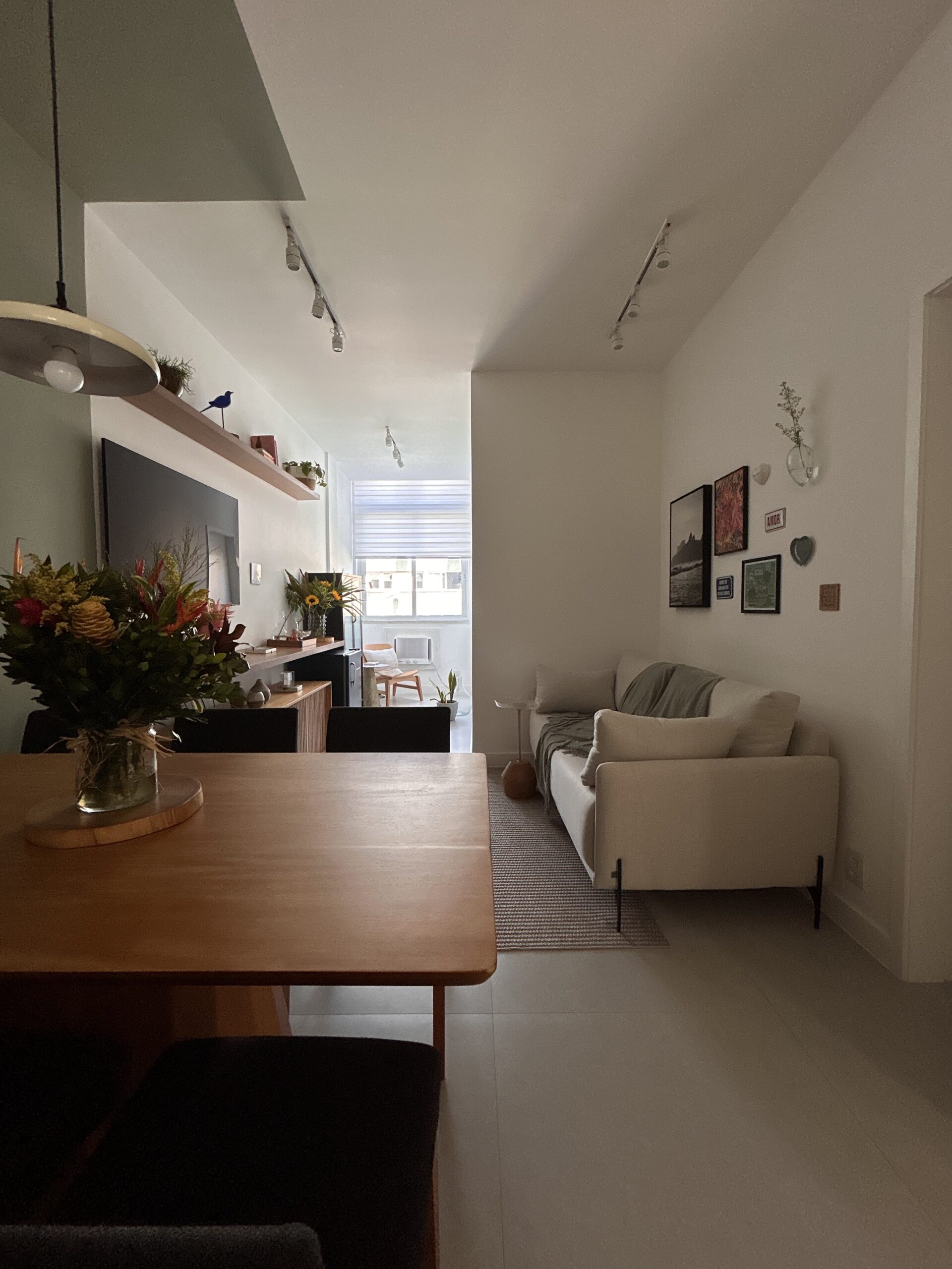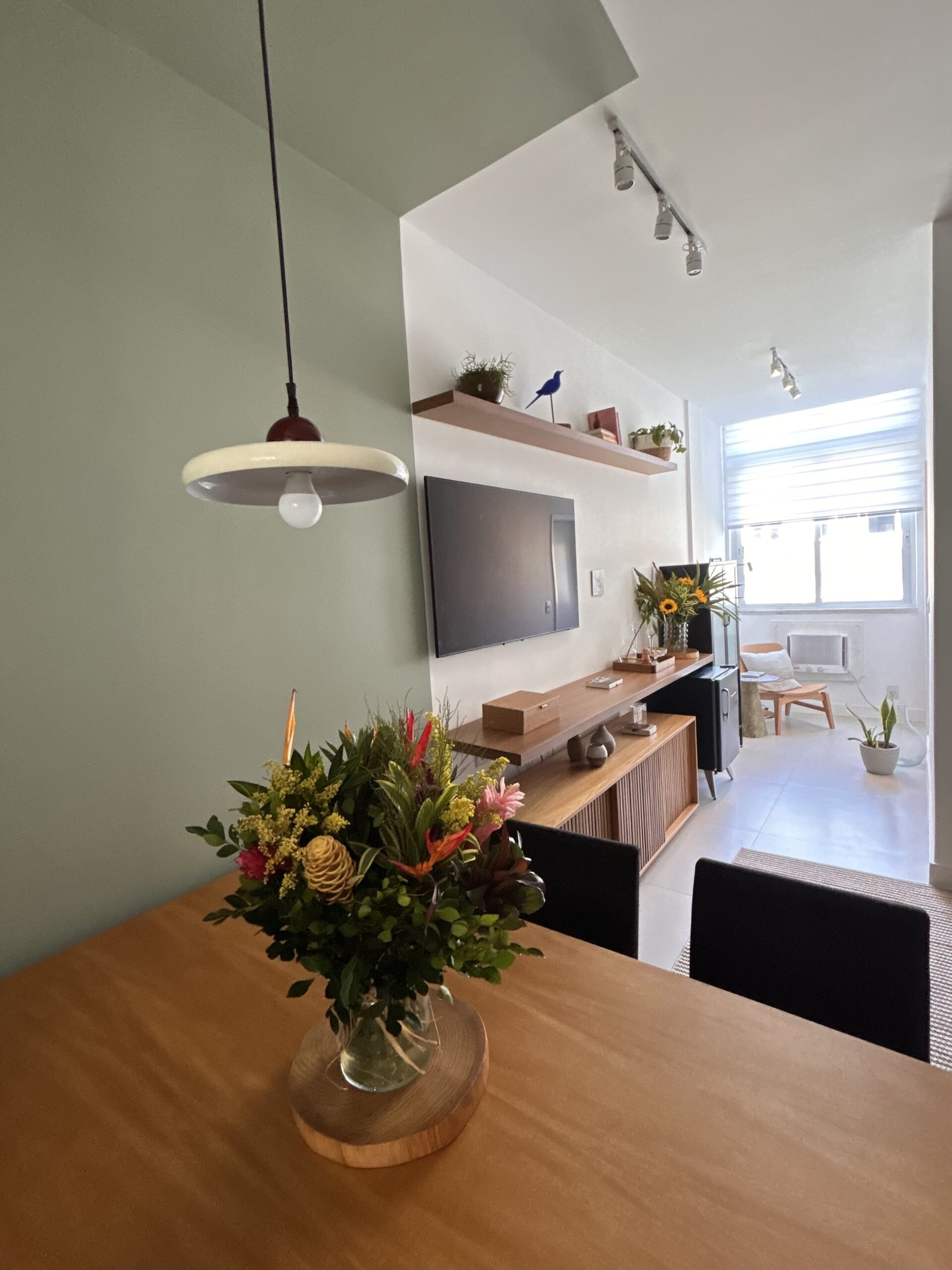 Este projeto nasceu a partir de uma consultoria para a sala de um apartamento alugado no Leblon. A cliente acreditava que o espaço, com cerca de 15 m², era pequeno demais para acomodar tudo o que ela desejava: sofá, televisão e, principalmente, uma mesa de seis lugares; item essencial para quem adora receber amigos e montar mesas postas com carinho.