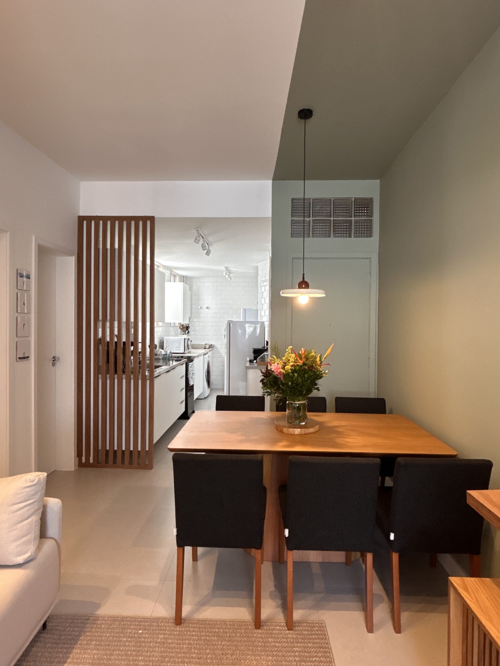 Partindo do maior desejo da cliente, a mesa de jantar para seis pessoas… o projeto foi desenvolvido com o objetivo de mostrar que, com planejamento e desenho inteligente, é possível aproveitar ao máximo cada metro quadrado e transformar a percepção do espaço.